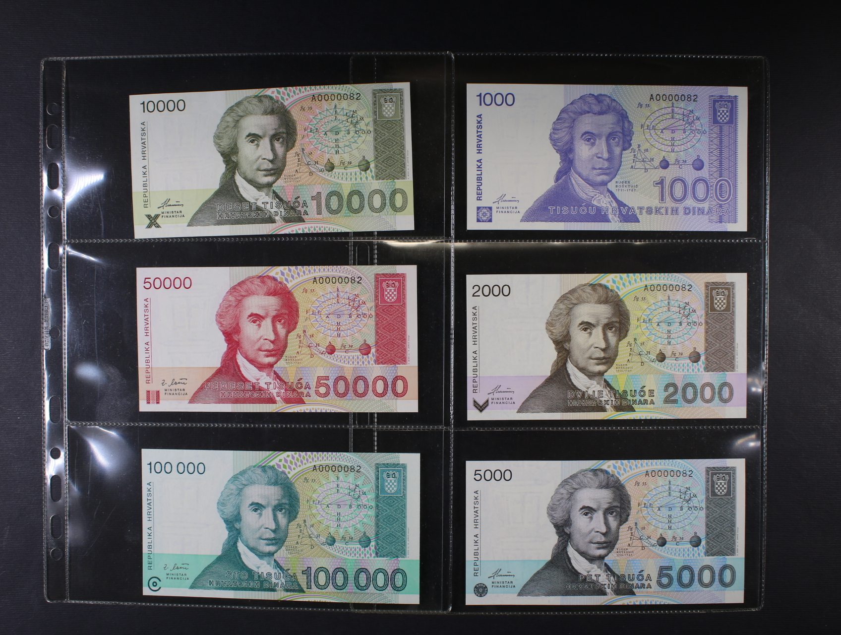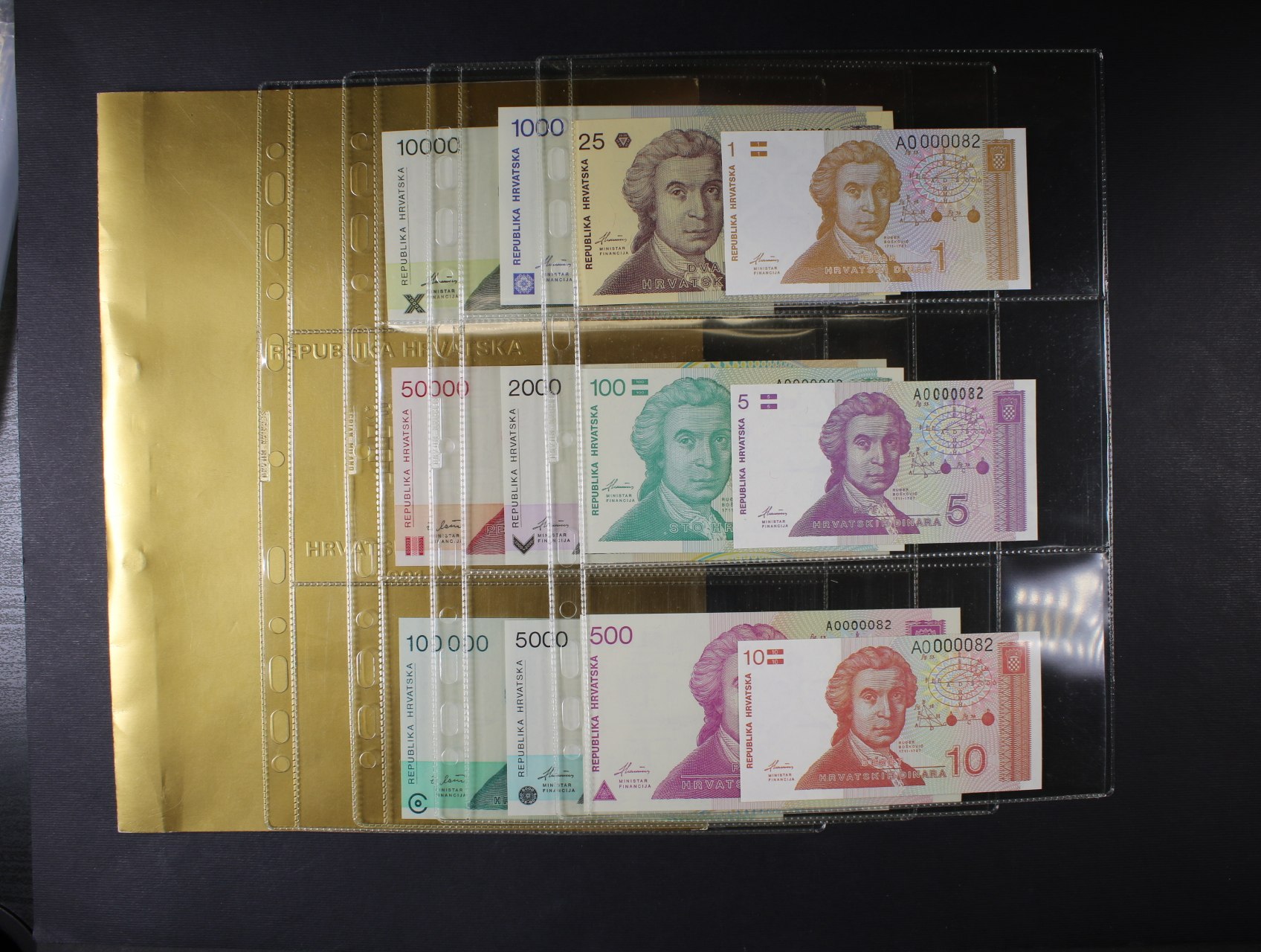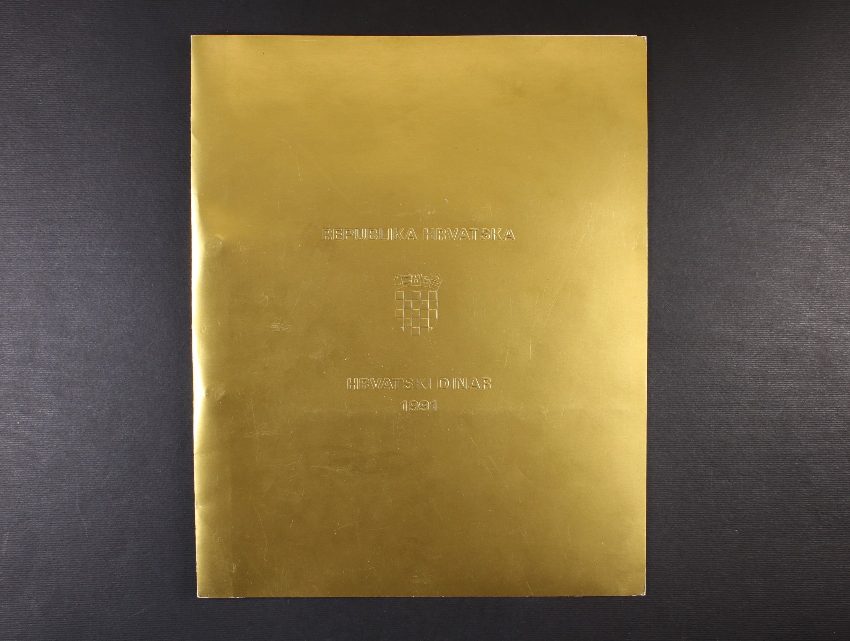prezentační album Hrvatska narodna banka s kompletní emisí nové měny 1 - 100.000 Dinara 1991, všechny stejná čísla A0000082 Pi.16-27, BNB. BNP301 - 312, celkem 12 kusů