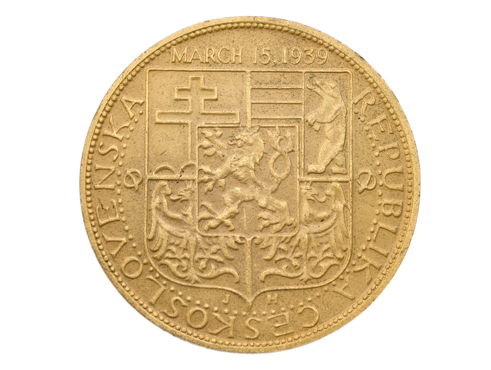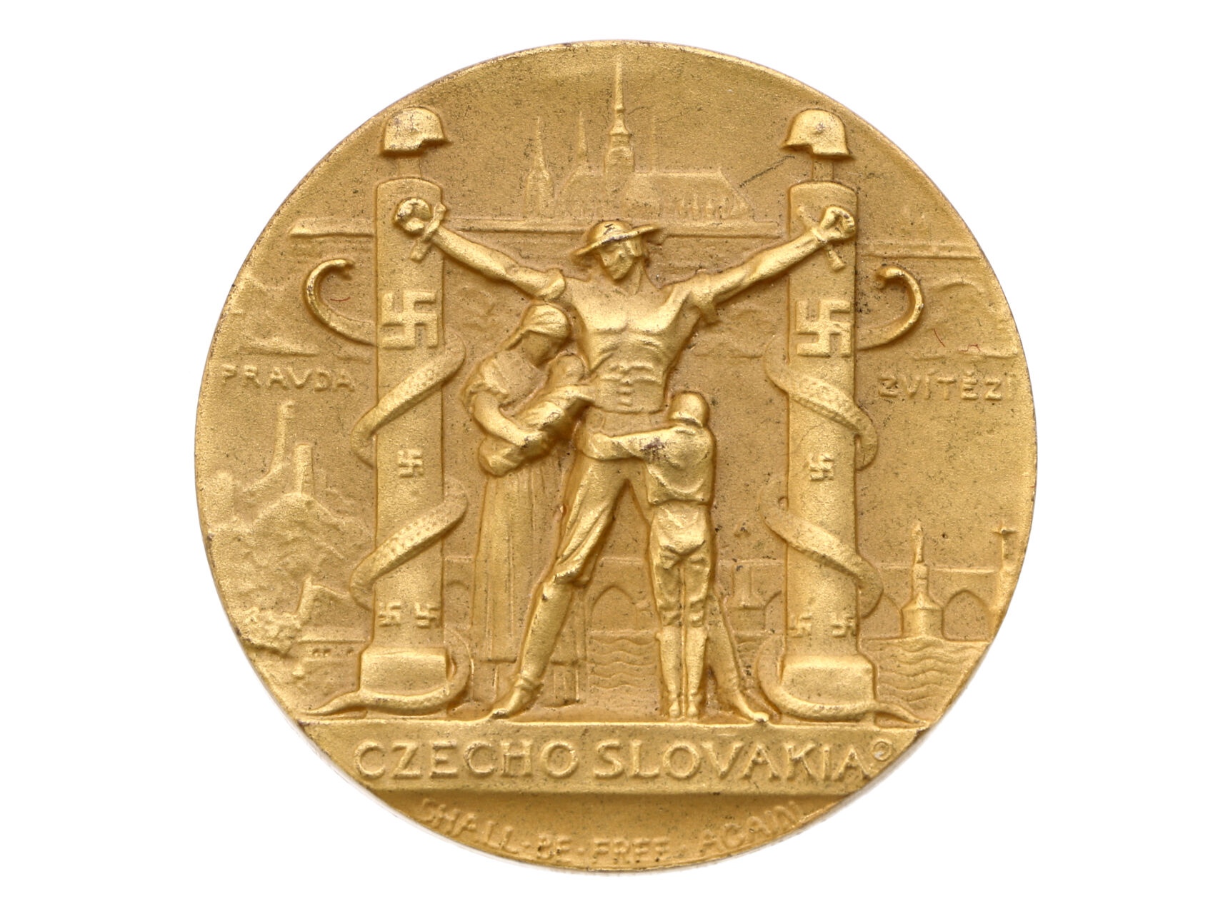 Protestní medaile proti okupaci Československa 1939. Junák přikovaný mezi dva sloupy, objímající chlapec a žena s dítětem, nad nimi pražský hrad, dole text / velký ČS znak, opis. Bronz 38 mm, signováno J H, na hraně značeno výrobcem MEDALLIC ART CO. N.Y.