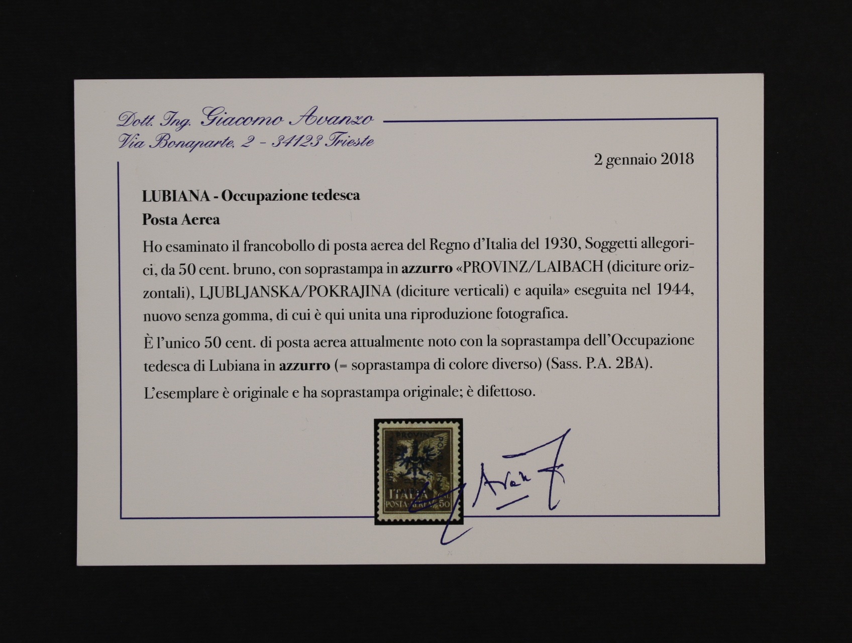PROVINZ LAIBACH 1944, Letecké - Sassone 2BA, italská 50C s přetiskem v modré barvě namísto černé; nevydané ministerské vydání, dochoval se tento jediný exemplář – UNIKÁT, s atestem G. Avanzo, „L’unico“, kat. 13000 EUR
