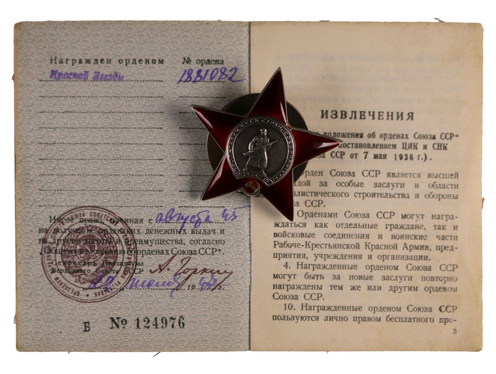 • Řád rudé hvězdy č.1881082, 6. typ, značeno Monetnyj Dvor, stříbro, smalt, k tomu řádová knížka