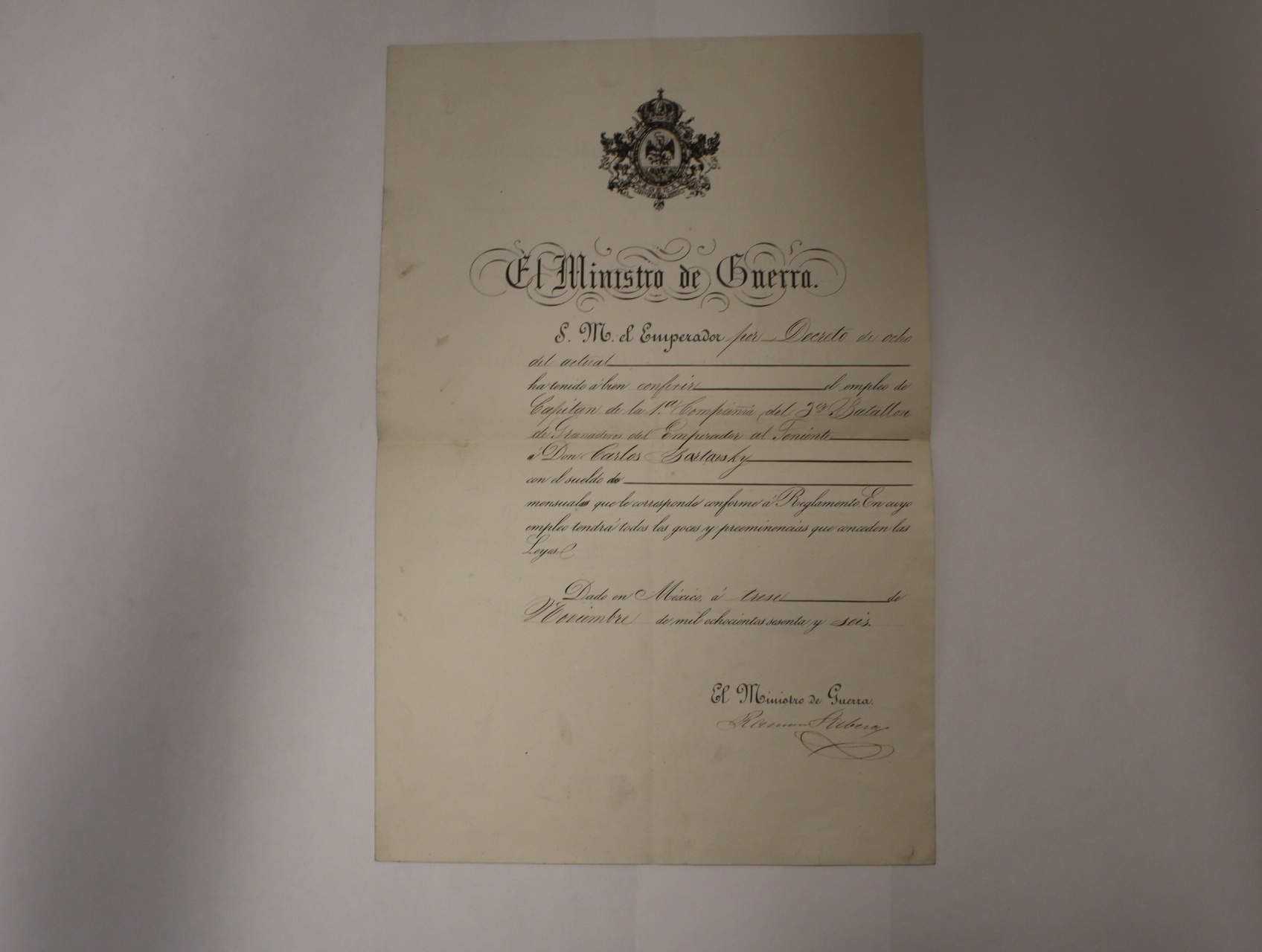 Rakouský dobrovolnický sbor císaře Maxmiliána I. v Mexiku 1866 jmenovací dekret kapitána 1. Companie 3. Batalionu na Karla Bartavského