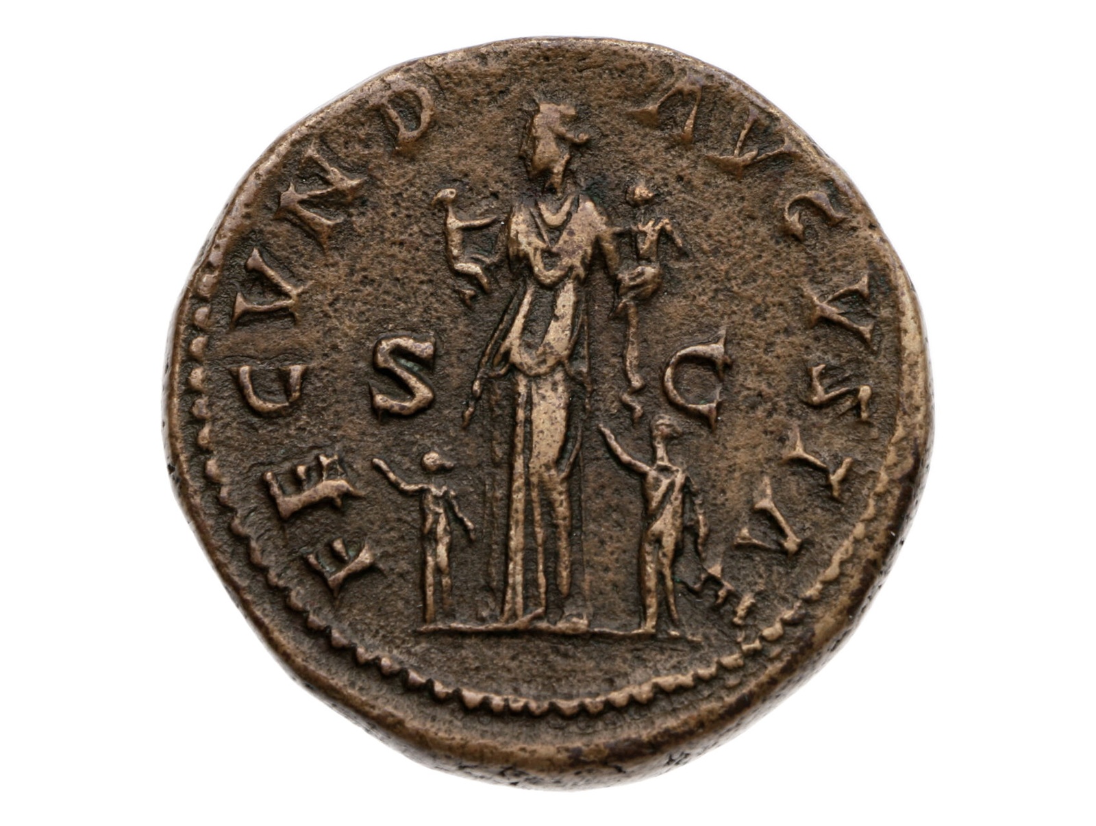 Řím císařství, Faustina Minor 176, manželka Marka Aurelia - AE Sestercius ražený za Marka Aurelia a Lucia Vera, Řím 161. Poprsí Faustiny vpravo, FAVSTINA AVGVSTA / Fecunditas stojící čelně, hlava doleva, držící v každé náruči kojence, děti stojící po obou stranách, svírající její tuniku, FECVND AVGVSTAE, S – C. 26,23 g., RIC 1635, KAMP 38.64