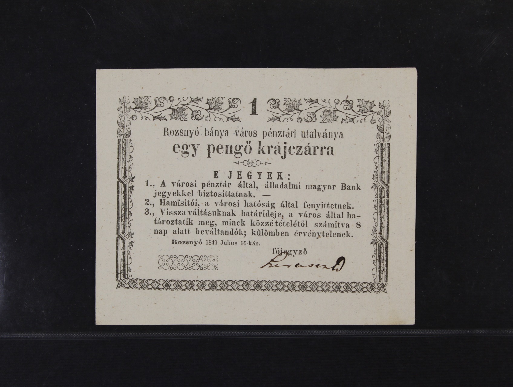 • Rozsnyó (Rožňava), 1 pengö krajczárra 29.8.1849, papír s vodoznakovou značkou, ADAM.- ROZ-1.1.2