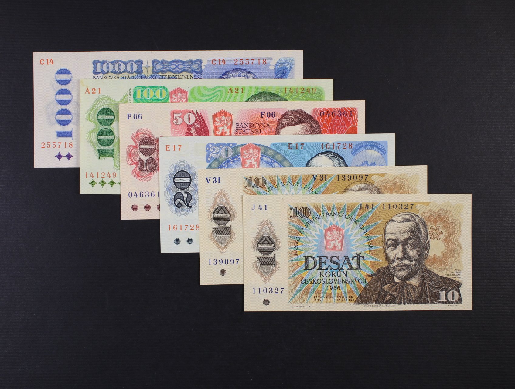 sada 10 Kčs 1986 série V 31, J 41, 20 Kčs 1988 série E 17, 50 Kčs 1987 série F 06, 100 Kčs 1989 série A 21, 1000 Kčs 1985 série C 14, celkem 6 kusů