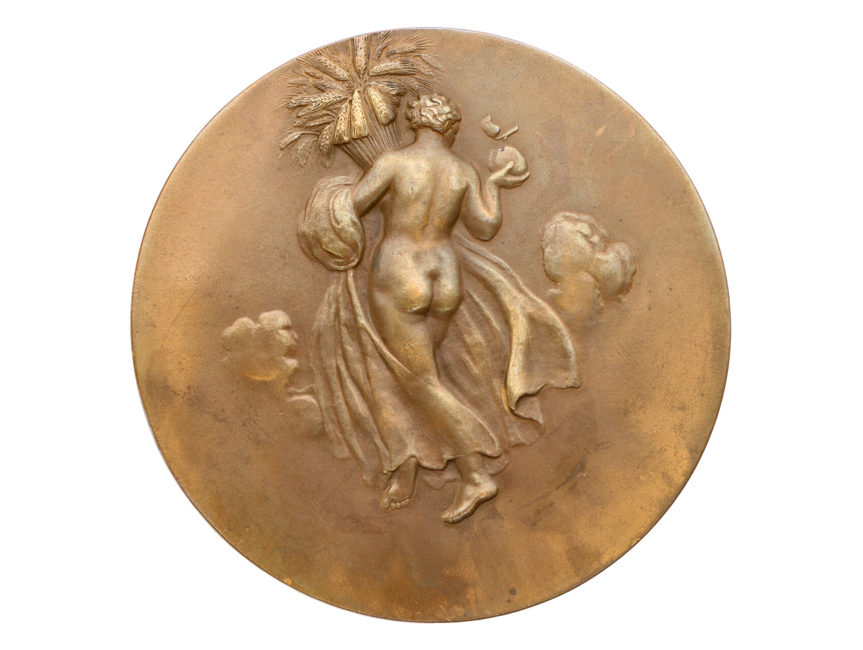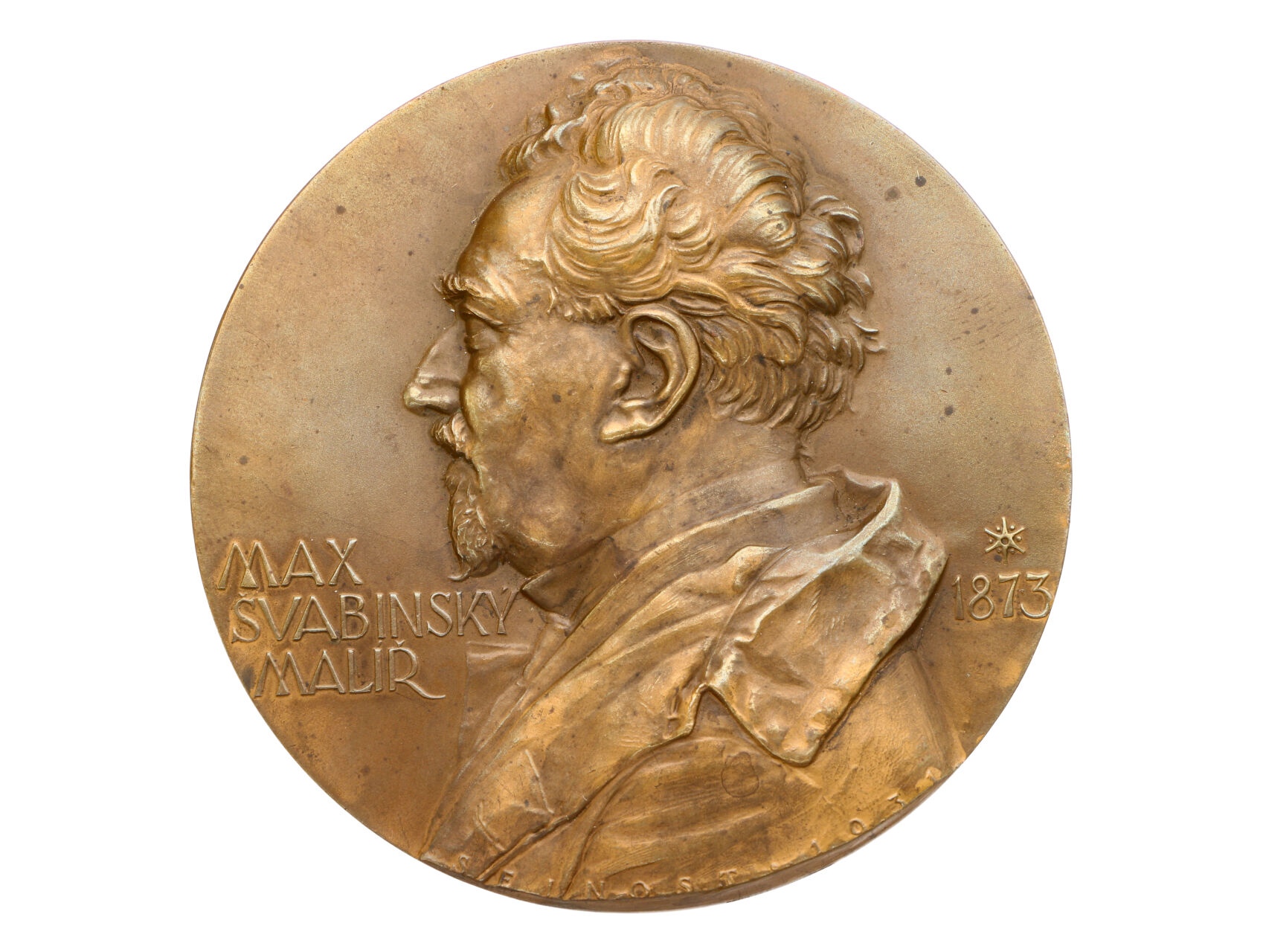 Šejnost Josef 1878-1941 - AE medaile 1931 - Švabinský Max, český malíř. Poprsí zleva, nápis vlevo, letopočet vpravo / Urpostřed je odcházející neoděná žena, nese v náručí kytici obilných klasů, v pravé ruce drží jablko a přes levou má přehozen šat, v pozadí oblaka. Bronz 80 mm, Bo.091b (raženo jen 56 ks)