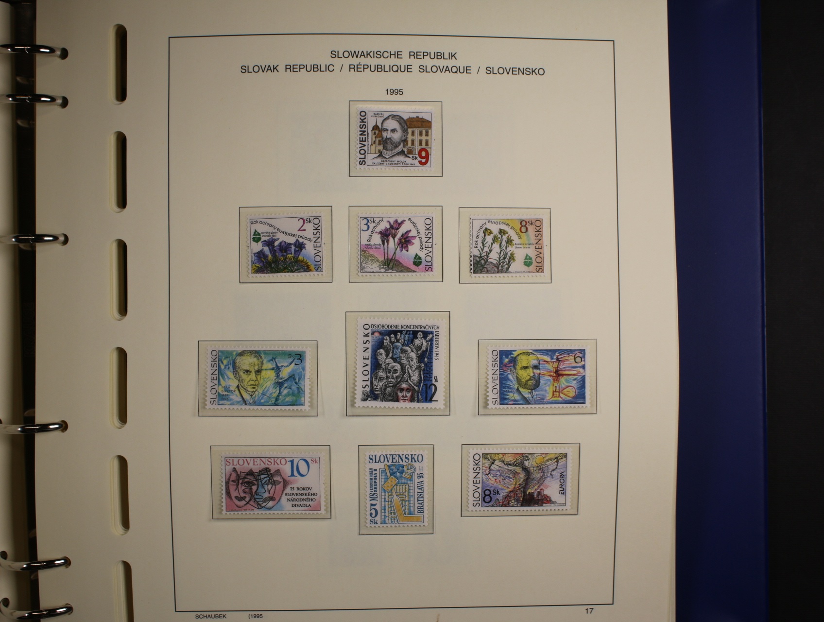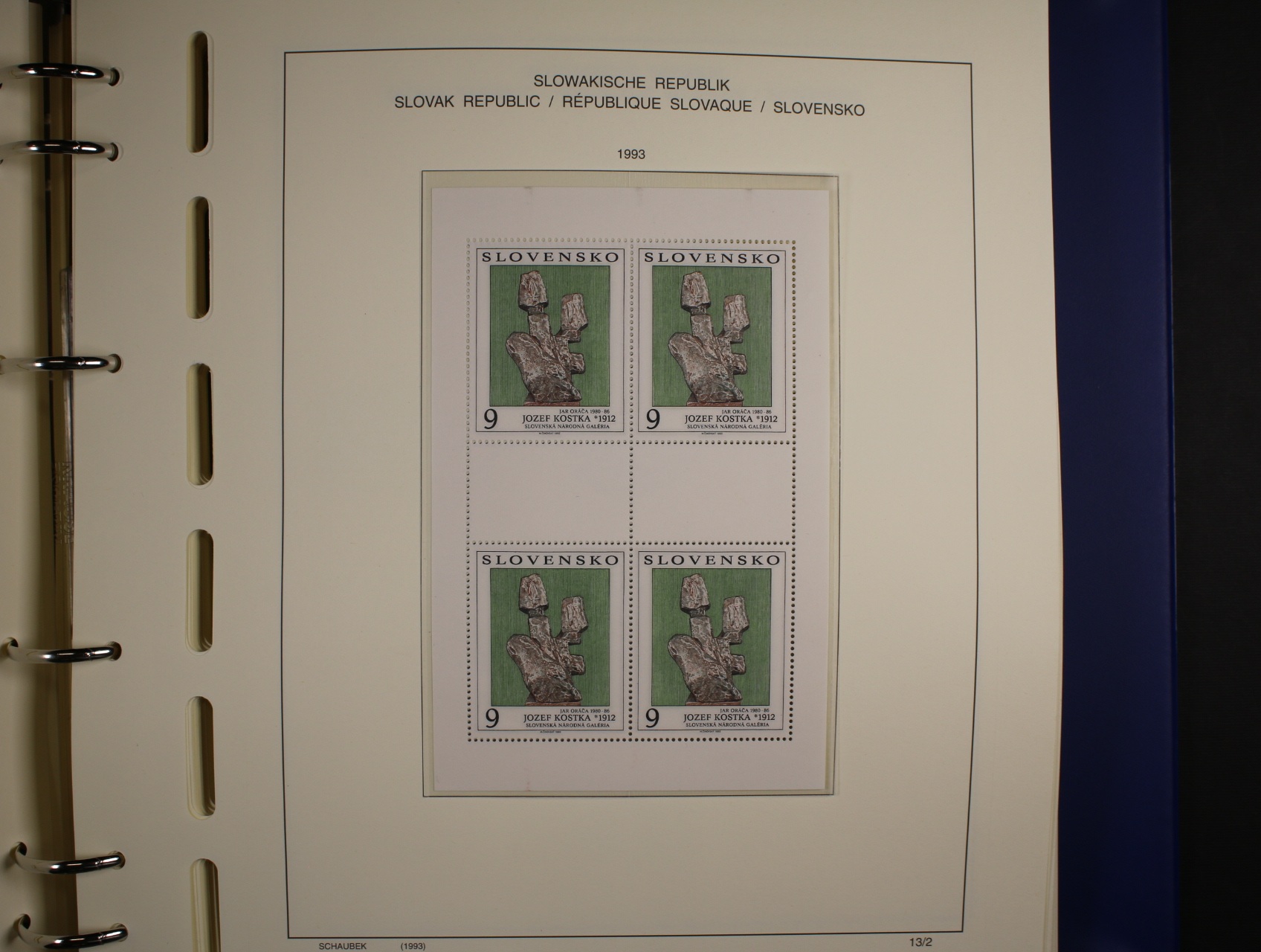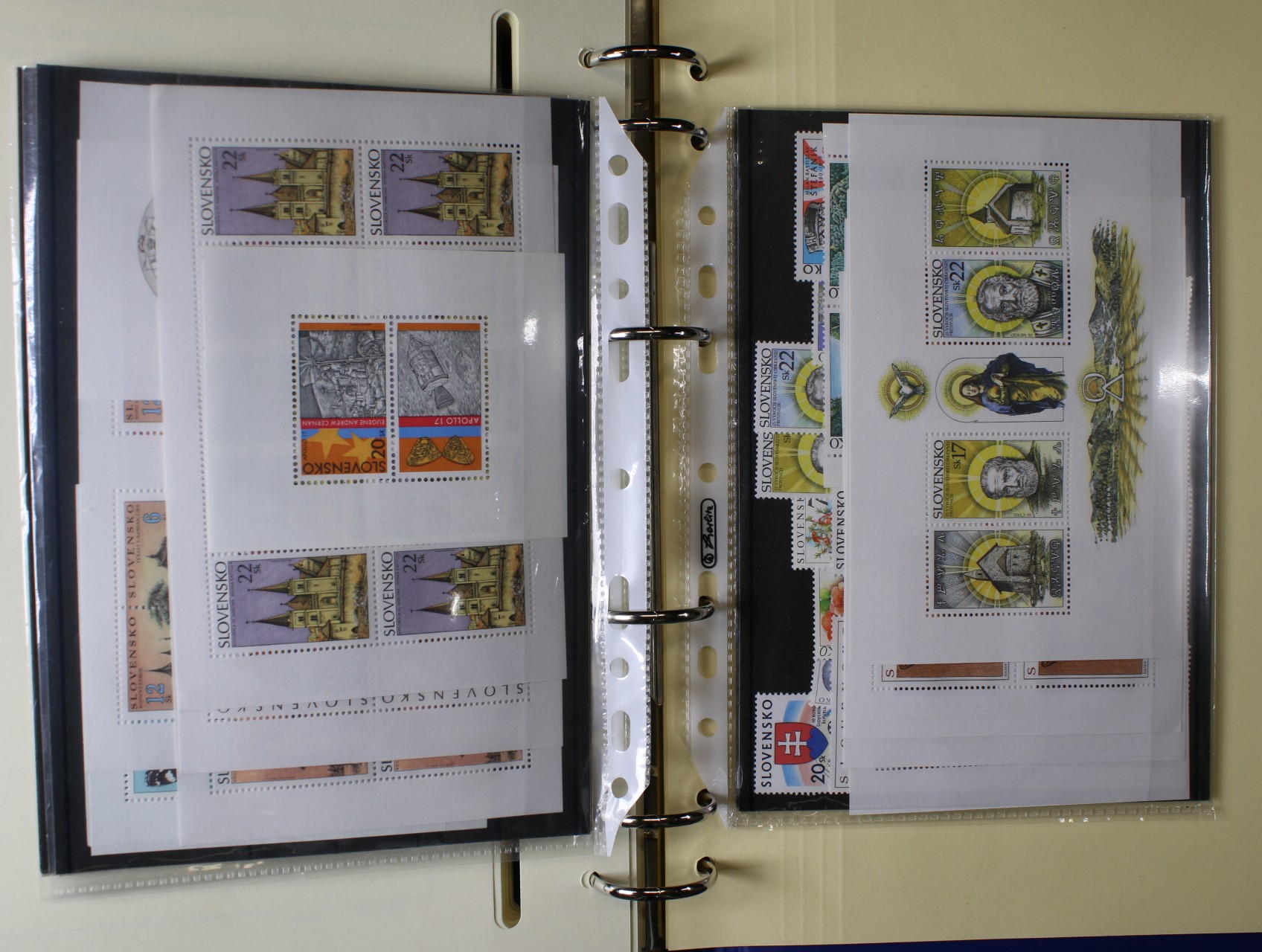 Slovenská republika - téměř kompl. sbírka zn., aršíků, PL, kuponů, soutisků z let 1993 - 2000, uloženo na zasklených listech Schaubek v modrém kroužkovém zásobníku v kazetě a od r. 2001 - 2004 přiložené zn. na destičkách formátu A5, kat. cena cca 800 EUR