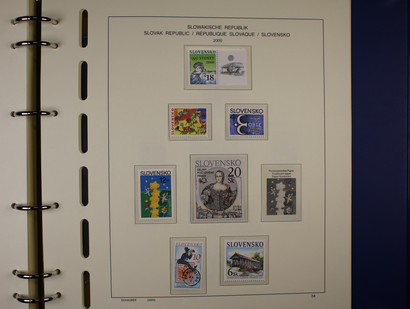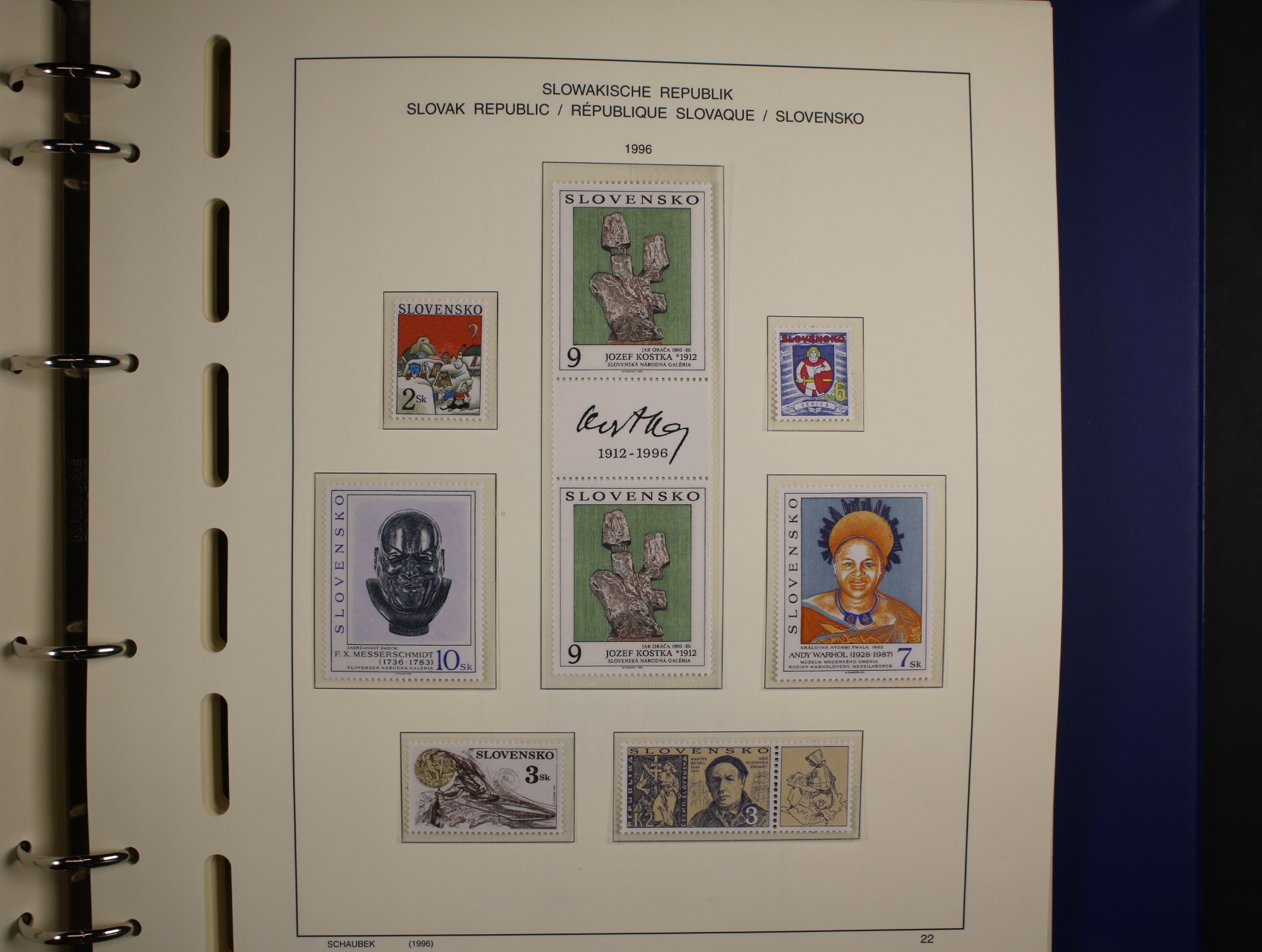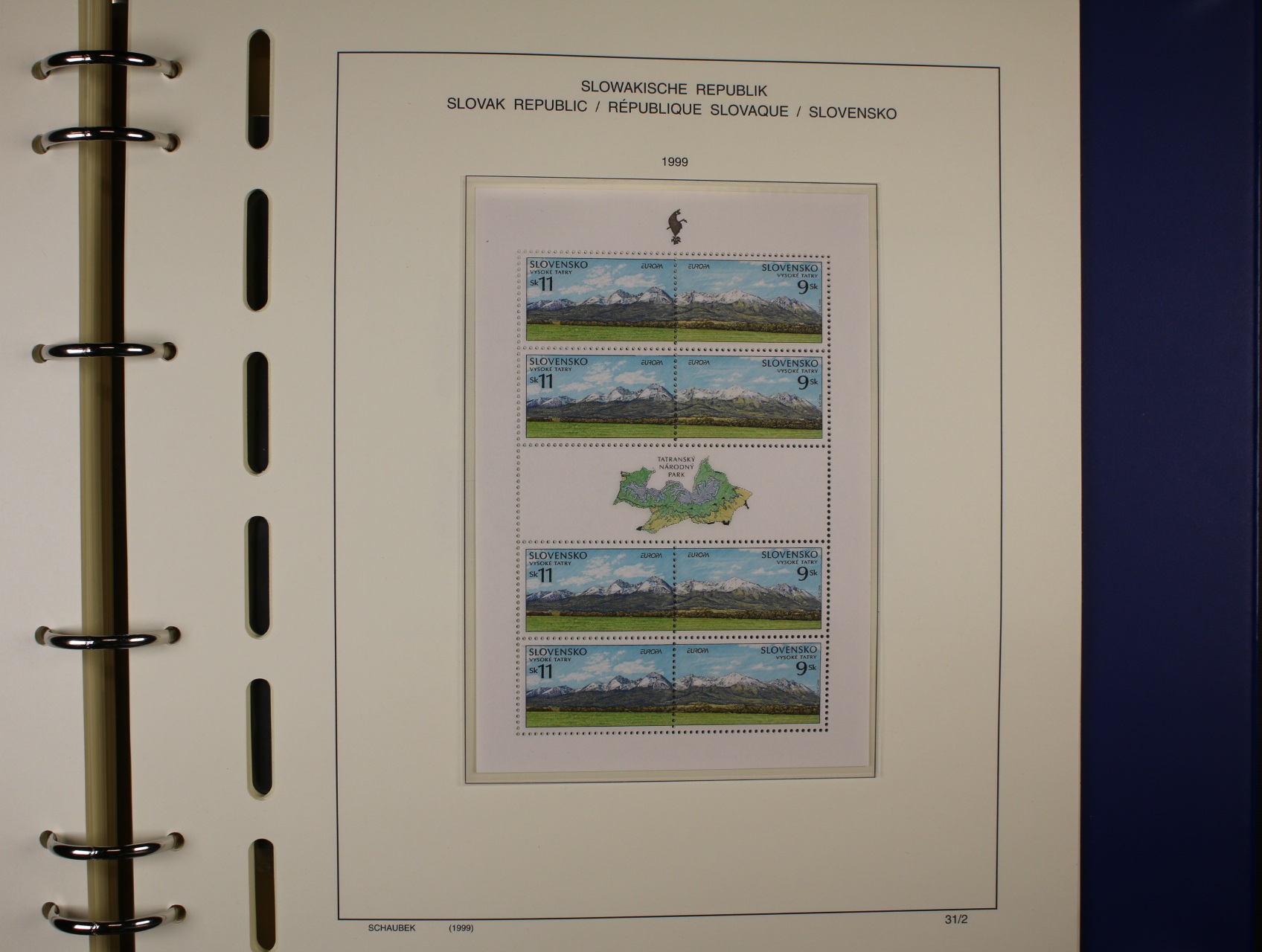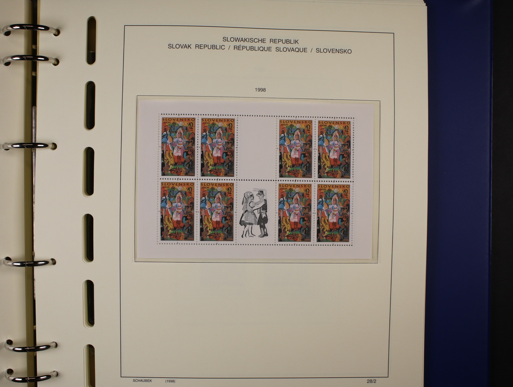 Slovenská republika - téměř kompl. sbírka zn., aršíků, PL, kuponů, soutisků z let 1993 - 2000, uloženo na zasklených listech Schaubek v modrém kroužkovém zásobníku v kazetě a od r. 2001 - 2004 přiložené zn. na destičkách formátu A5, kat. cena cca 800 EUR