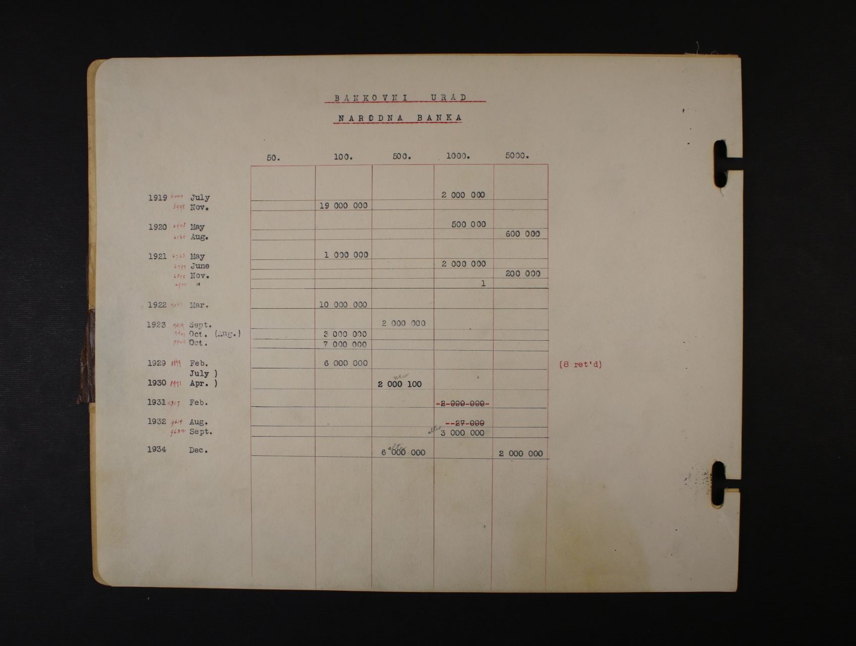 • strana z alba z archivu tiskárny ABNCo s rozpisem počtu vytištěných bankovek od r.1919 - 1934, zajímavý dokument