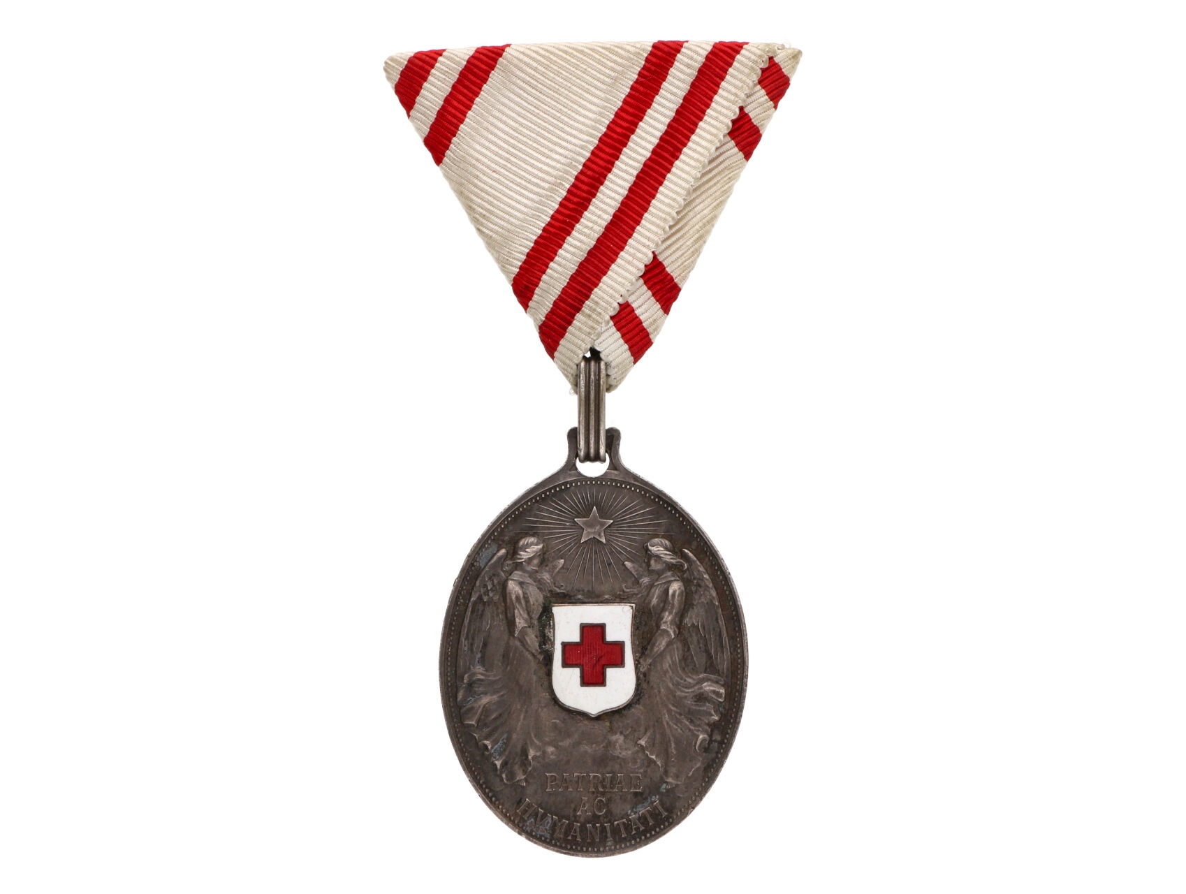 • Stříbrná čestná medaile za Zásluhy o Červený kříž, postříbřený kov, původní trojúhelníková stuha, Marko 162b