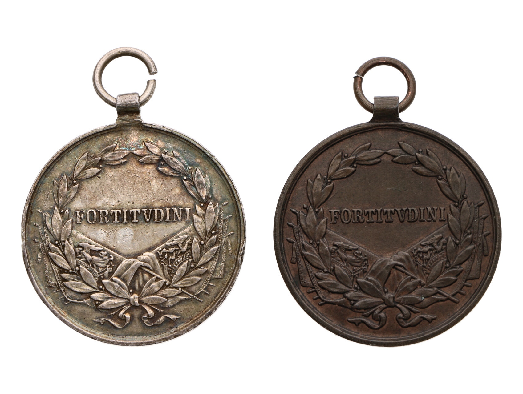 Stříbrná medaile za statečnost 2. třídy, 9. vydání 1917-1918 Karel, na hraně punc hl. puncovního úřadu Vídeň, A v kroužku, k tomu bronzová, obě bez stuhy, Marko235a, 236a