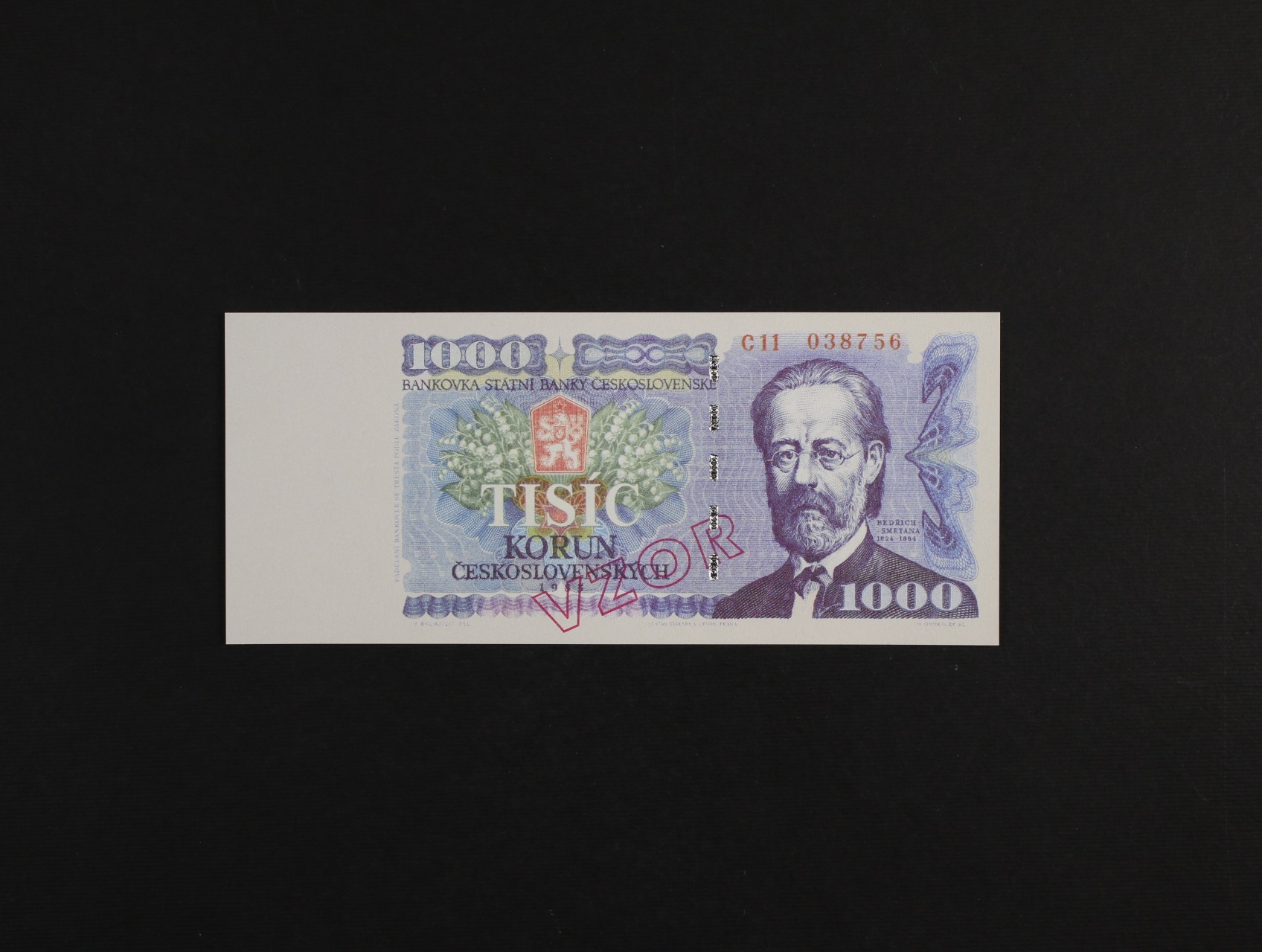 studijní bankovka ČNB pro školení zaměstnanců, 1000 Kčs 1985 - typ tisku čtyřbarvotisk, napodobení okénkového ochranného prožku s mikrotextem 5000 Kč, červený přetisk VZOR, na R evidenční číslo, podrobný popis