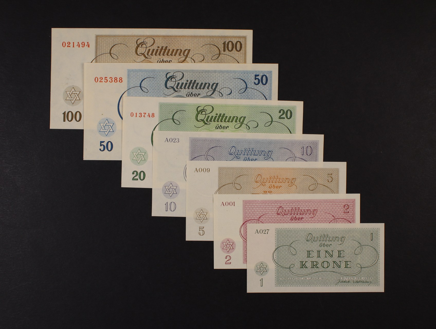 • Theresienstadt (Terezín)  1 K - 100 K 1.1.1943 sada 7 ks, Ba. 311.4.1 - 7, Pi.-Si. 25 - 35