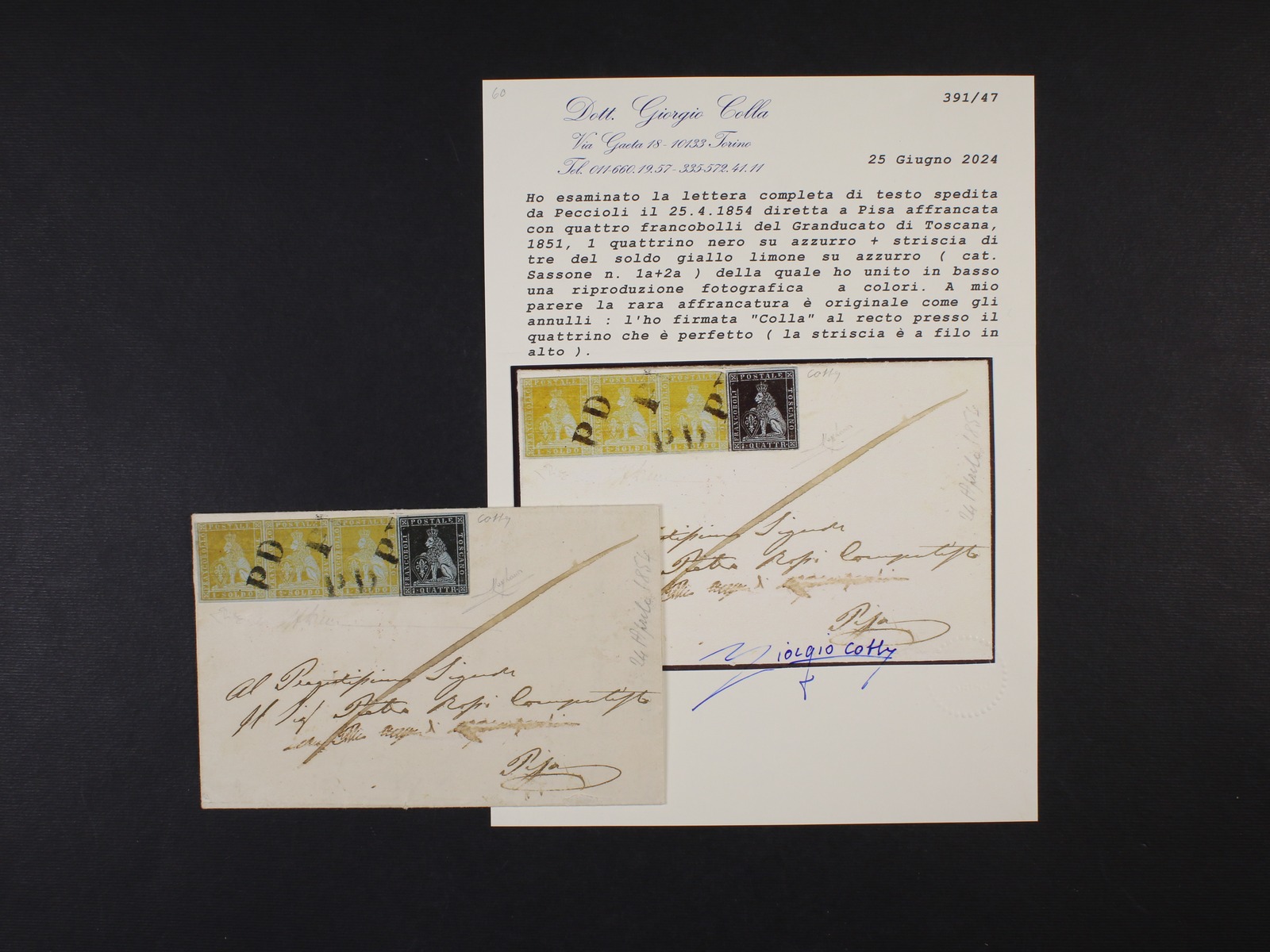 Toskánsko - skl. dopis v místě odeslaný 25.4.1854 do Pisy, frank. zn. Sas. č. 1a 1quattr nero azura, lux. střih, a třípáskou Sas. 2a 1Soldo, lux. střih, přích. PISA 26.4.1854, dopis frank. smíš. frankaturou Quattro + Soldi je velmi vzácný, zk. a atest Prof. Giorgio Colla, kat. min. 112000 EUR+