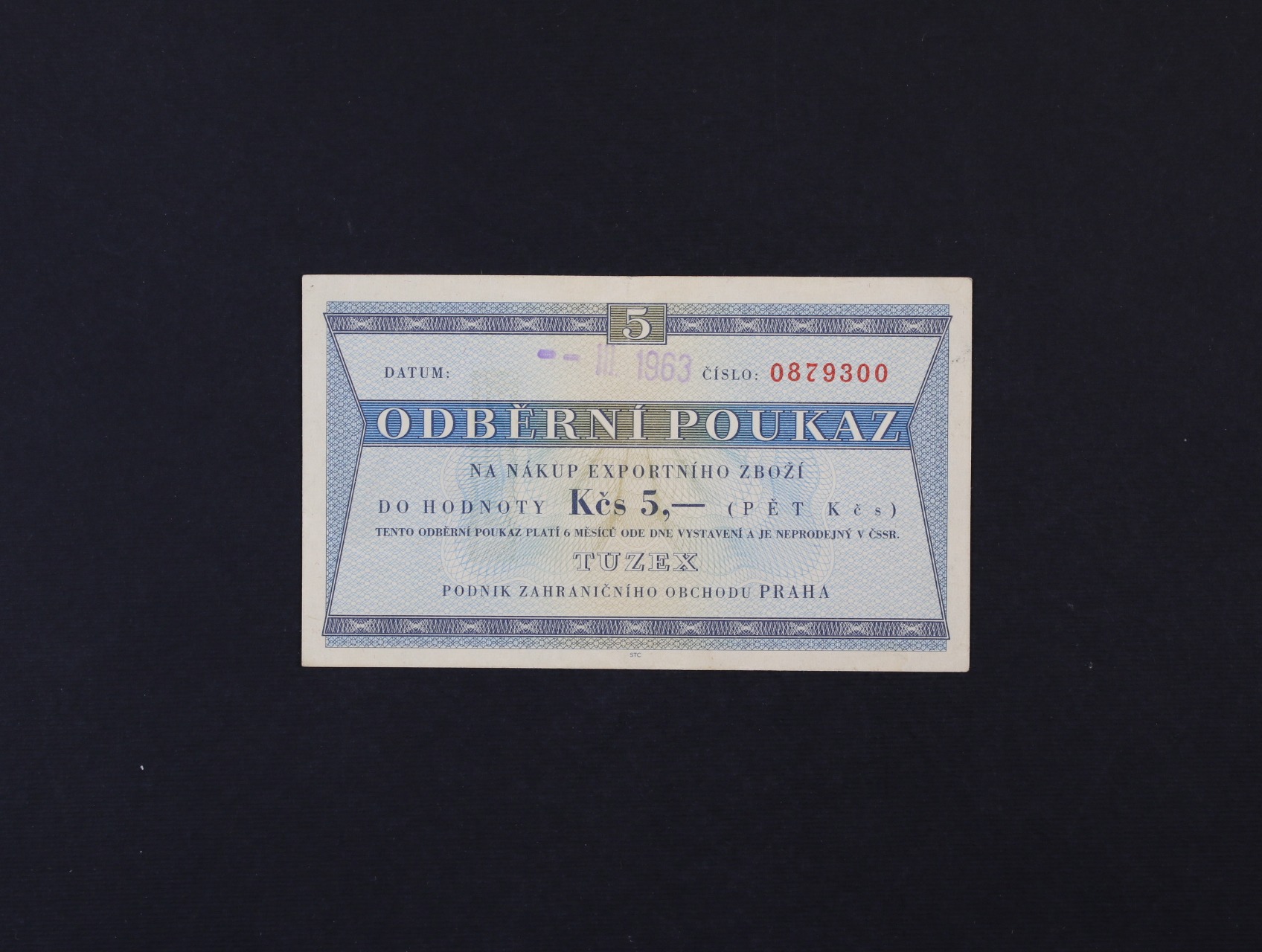 • Tuzex, 5 TKčs bez data s raz. III.1963, na rubu s modrou giloší, K.Š.K. 35/V/1a, vzácný