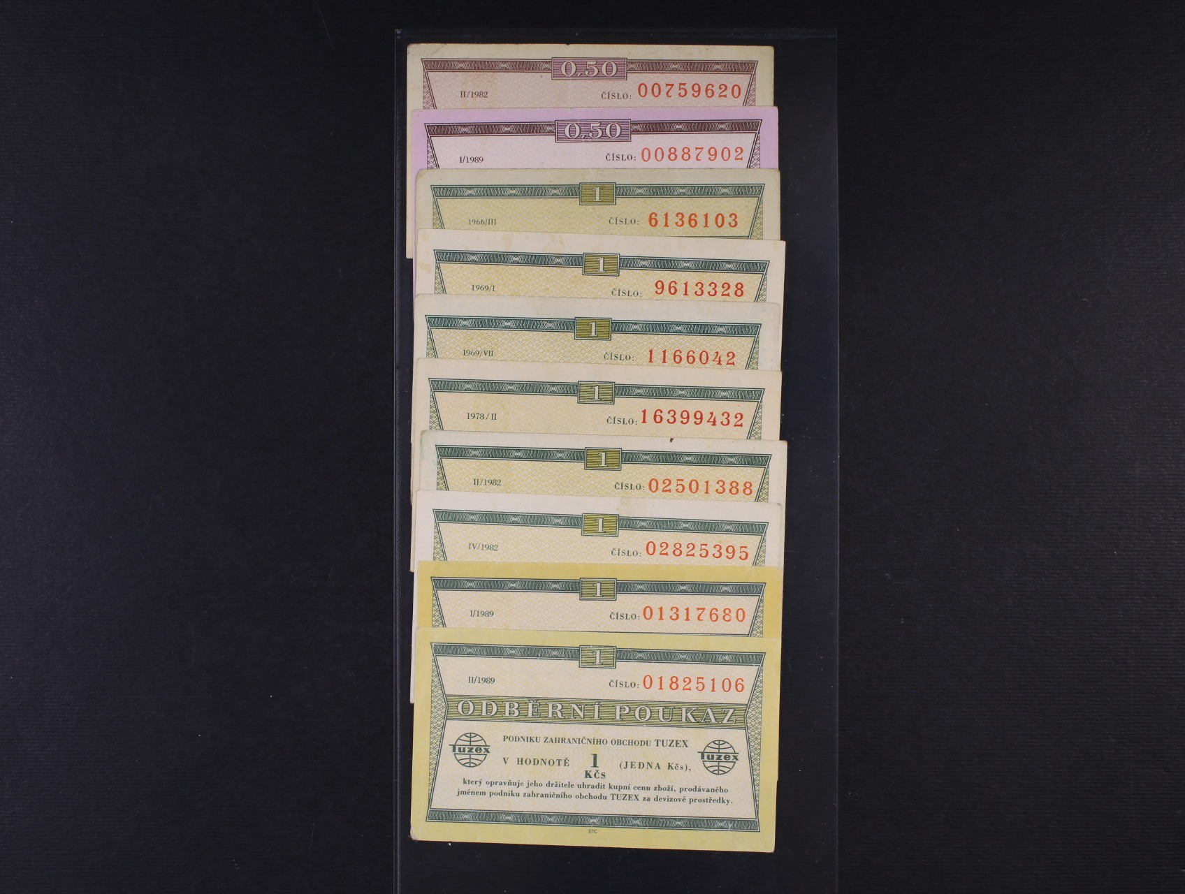 Tuzex, sestava 0,50 TKčs II/1982, I/1989 a 1 TKčs 1966/III, 1969/I, 1969//VII, 1978/II, II/1982, IV/1982, I/1989, II/1989, celkem 10 kusů