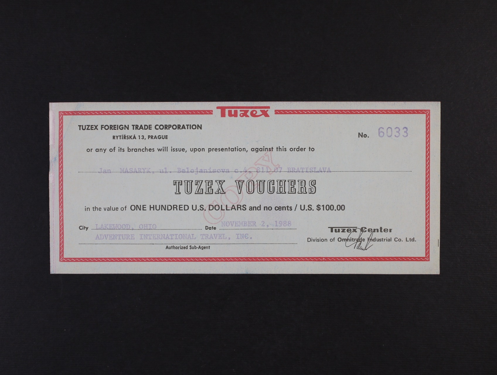 • Tuzex Vouchers 100 USD na nákup zboží v prodejnách Tuzex s datem 2.Nov.1988, vydavatel