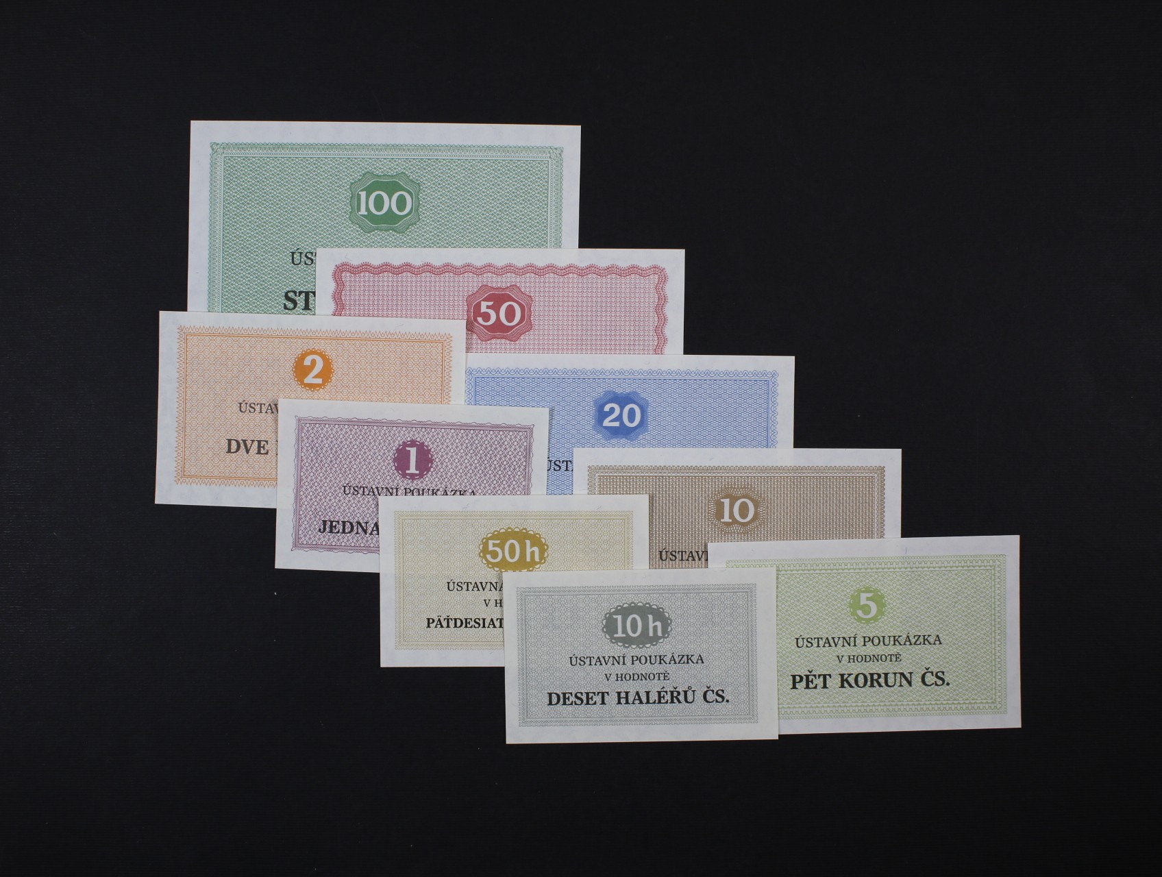 Ústavní poukázky 10 h, 50 h, 1, 2, 5, 10, 20, 50 a 100 Kčs, celkem 9 kusů, kompletní sada