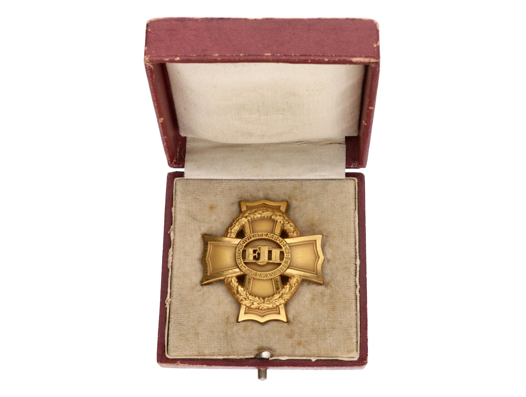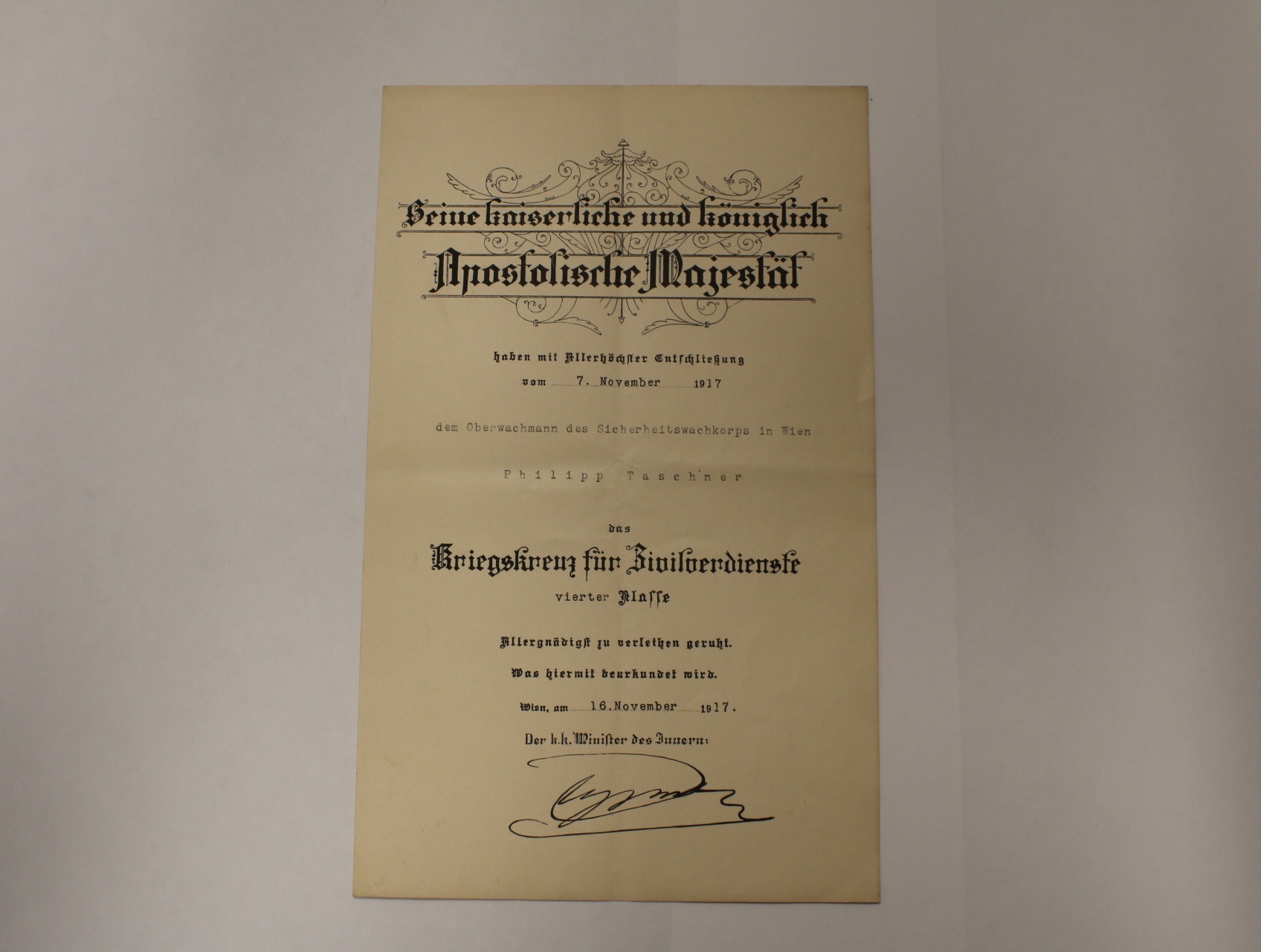 • Válečný kříž Za občanské zásluhy IV. třídy, pozlacený bronz, na reversu značka B, původní etue a udělovací dekret, s datem udělení 7.11.1917, Marko154