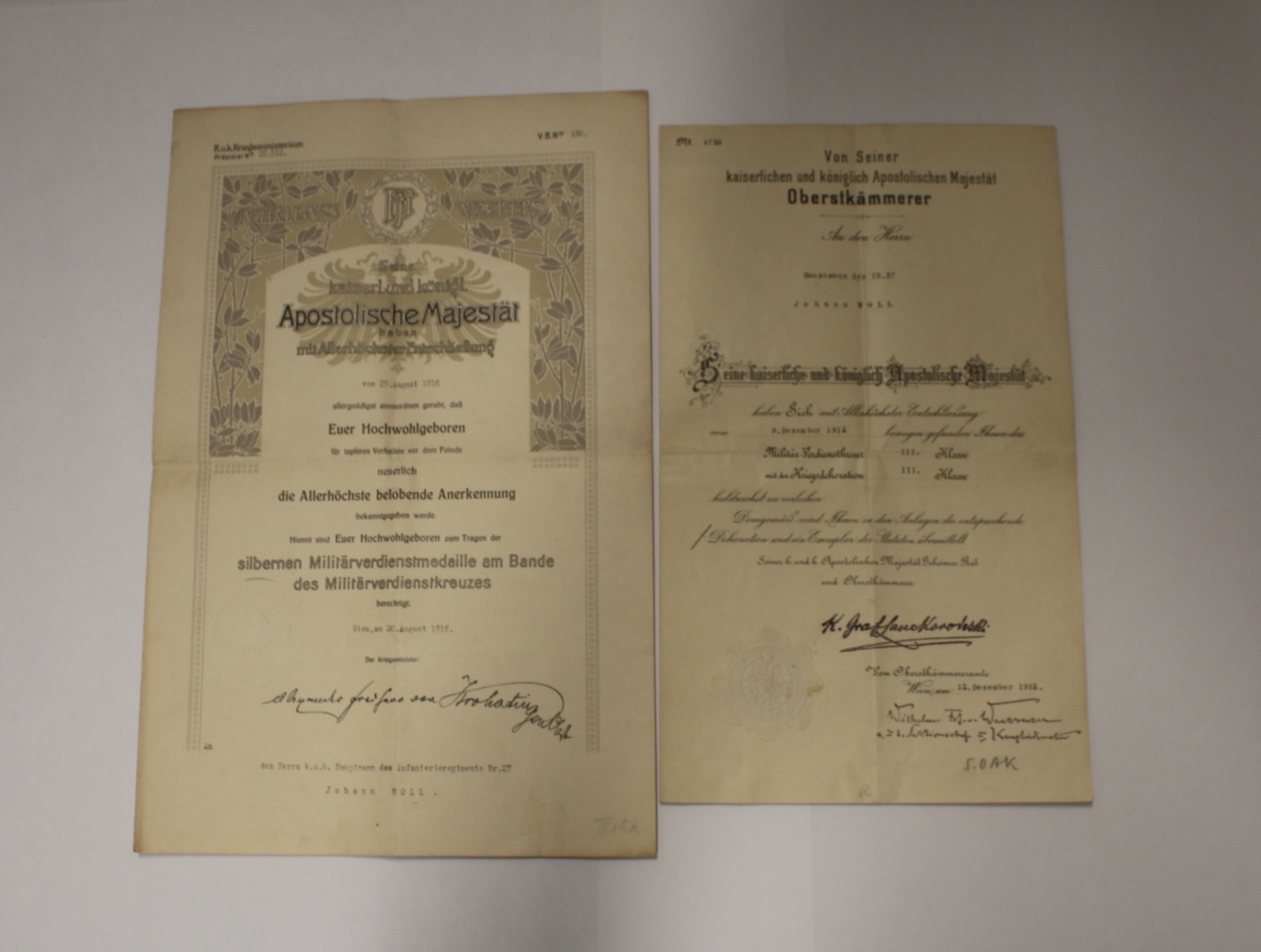 Vojenský záslužný kříž III. třídy s válečnou dekorací, punc Ag, značka výrobce VM (Vincenz Mayer´s Söhne Wien), původní vojenská stuha a Stříbrná vojenská záslužná medaile Signum Laudis F.J.I., na kroužku punc Ag a značka výrobce, původní voj. stuha, k oběma jsou udělovací dekrety na kapitána pěšího pluku 27, MVK 9.12.1915, MVM 29.81916, Marko136g a 146a