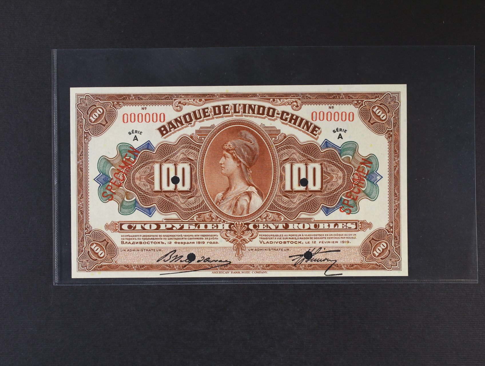 Východní Sibiř - Vladivostok, 100 Rubles 12.2.1919 Indo - čínská banka, anulát s 2x přetiskem SPECIMEN a s 2x perf. otvorem, Pi. S 1258