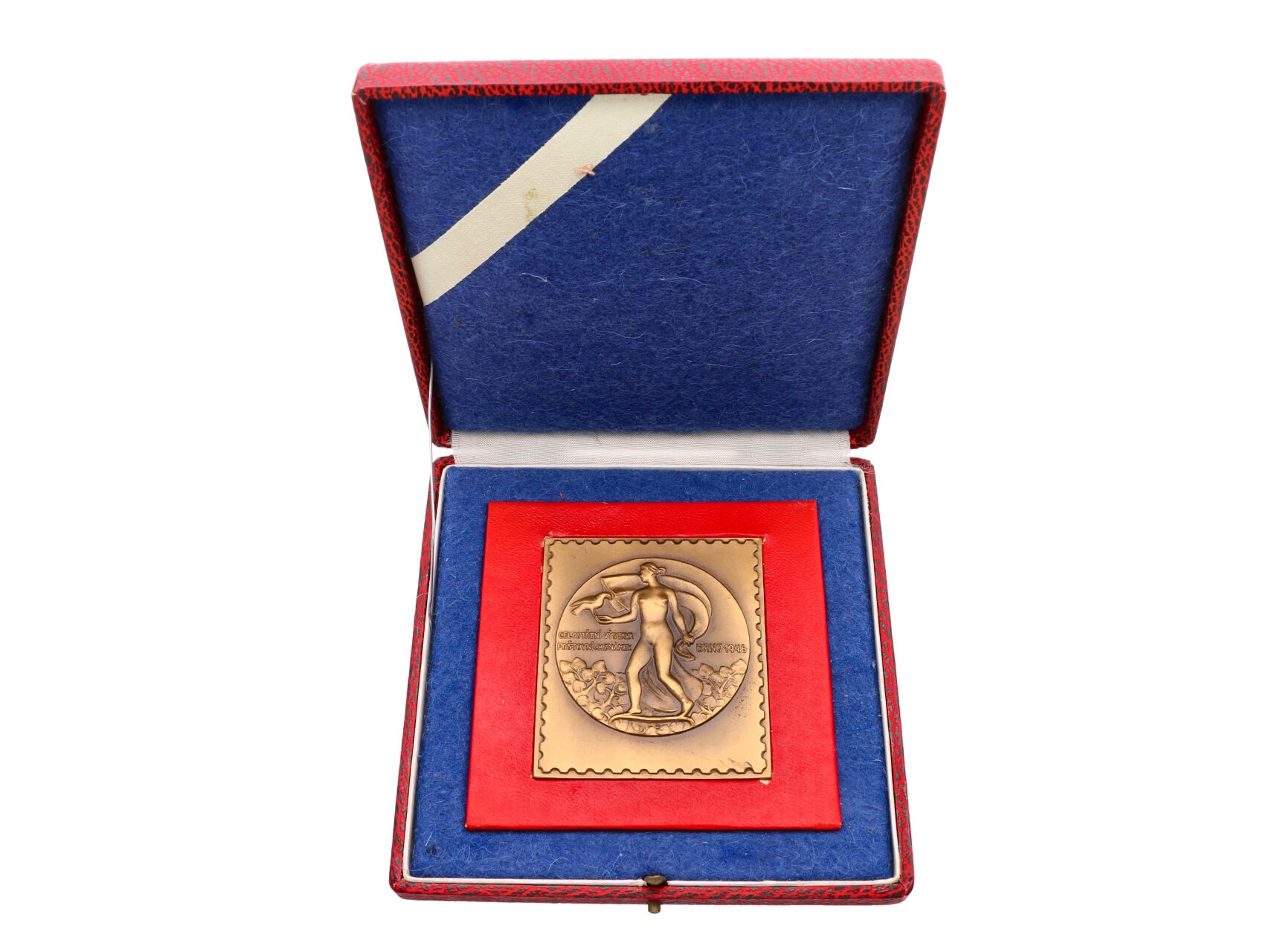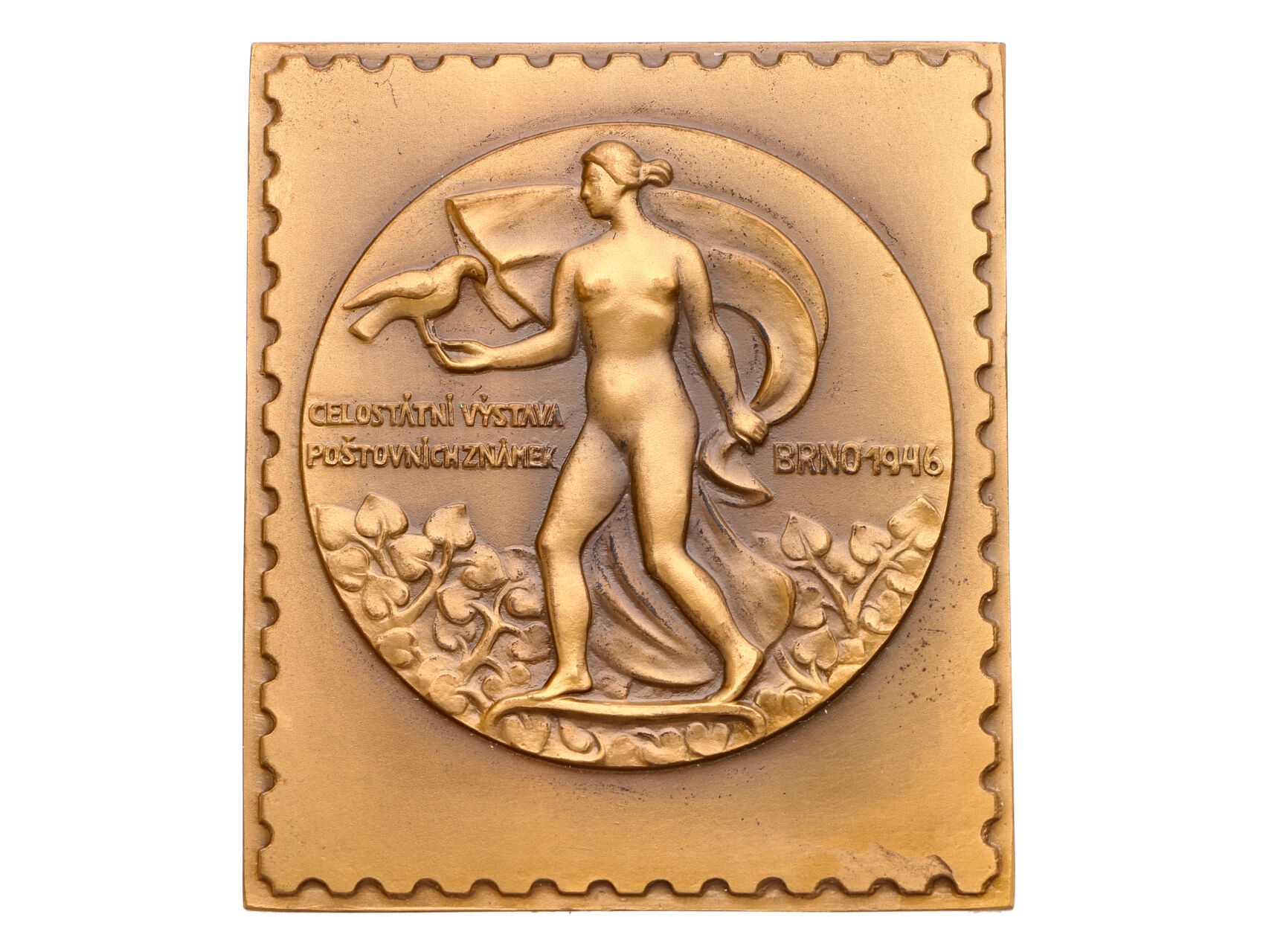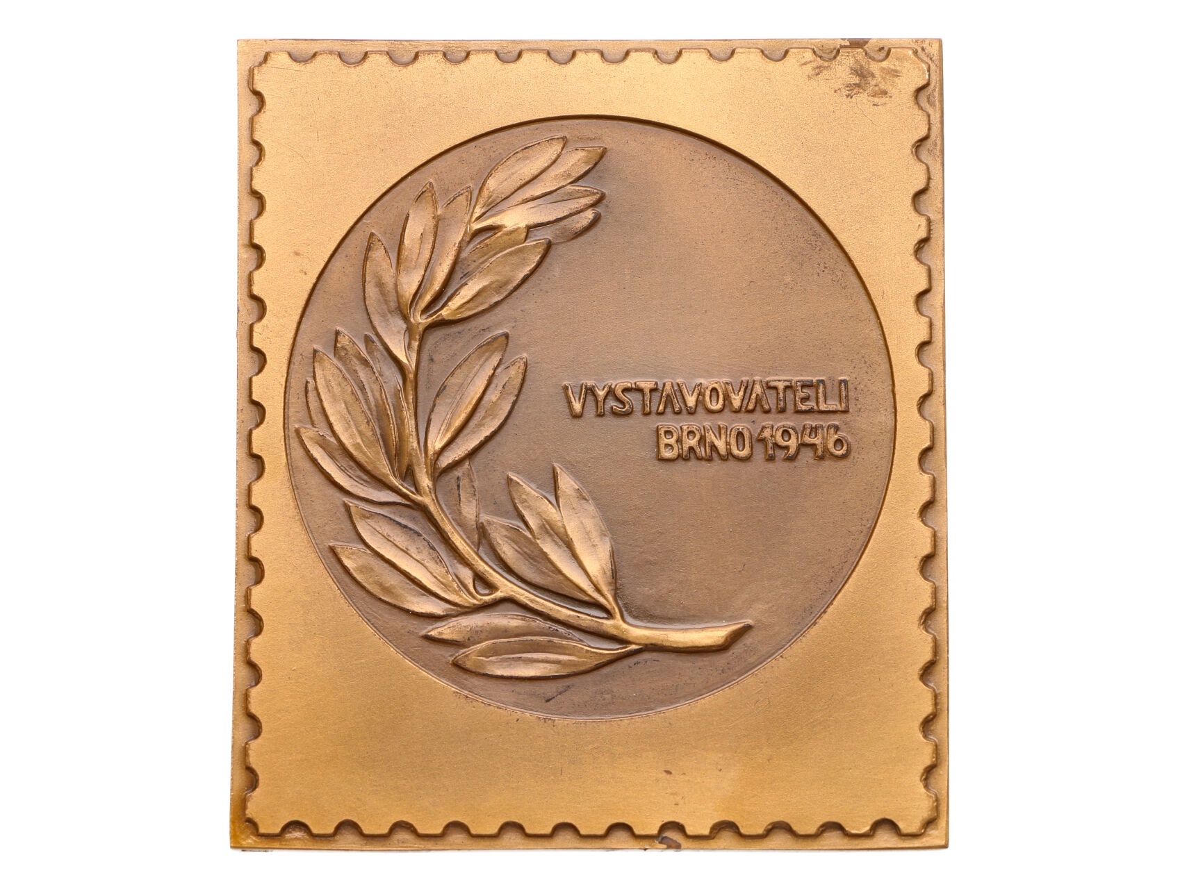 • Výstavy filatelistické - AE medaile pro vystavovatele z Celostátní výstavy poštovních známek Brno 1946. Bronz 68x59 mm, 122,30 g., původní etue