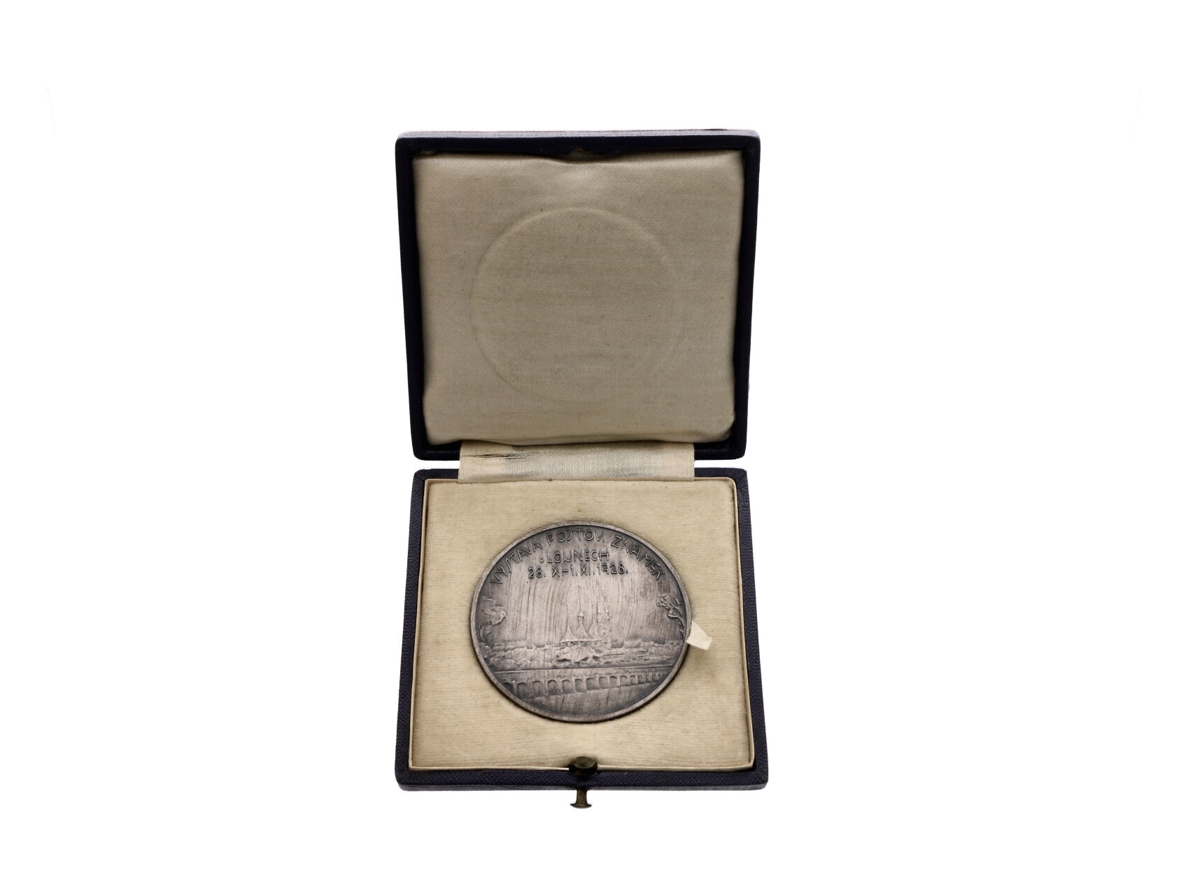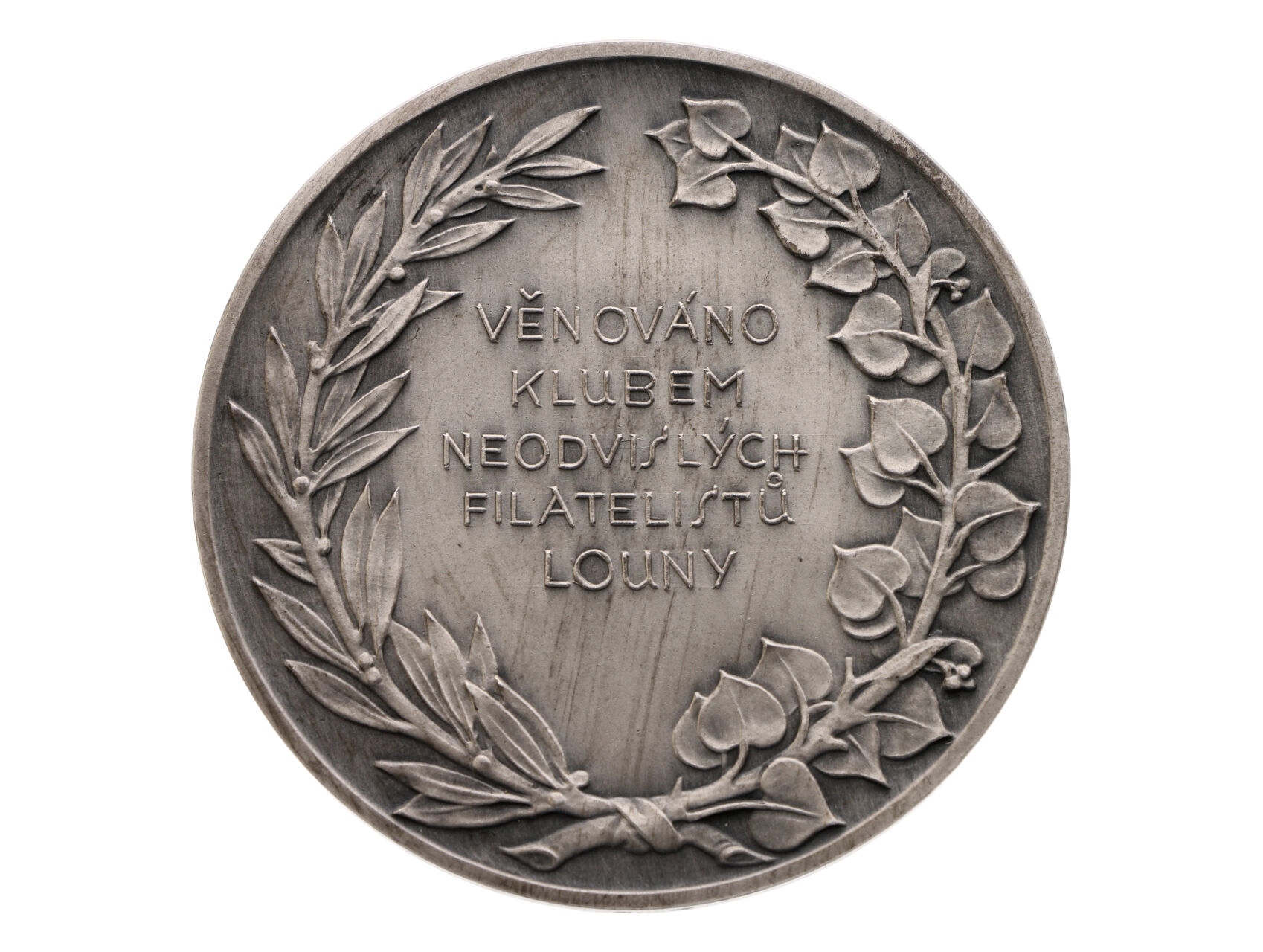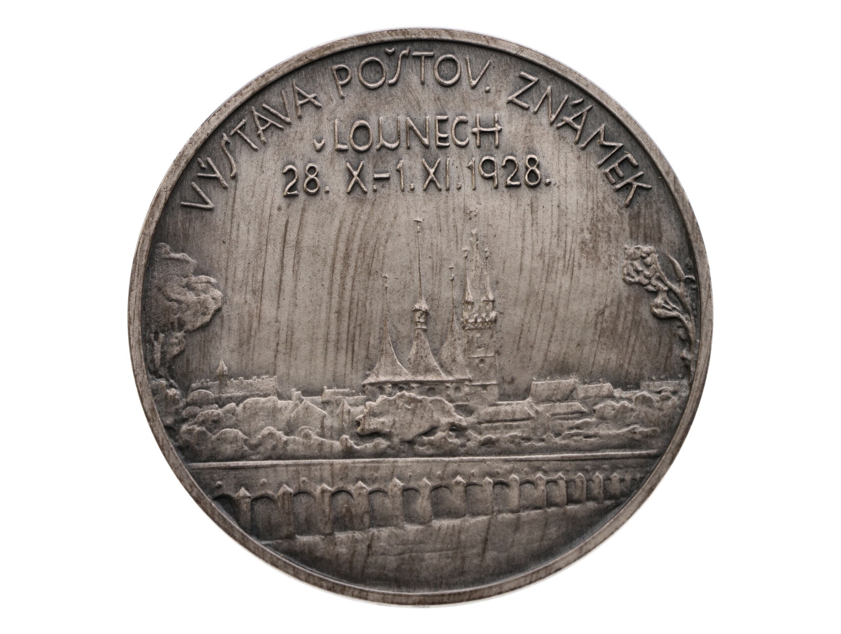 Výstavy filatelistické - AR medaile 1928, výstava poštovních známek v Lounech 28.10.-1.11.1928. Panorama města s dominantou Chrámu sv. Mikuláše a mostu přes Ohři, částečný opis, text / Vavřínovo lipový věnec, text. Stříbro průměr 50 mm, 49,22 g., na hraně punc Ag pro ryzost 900 a značka výrobce FA (Franta Anýž), původní etue