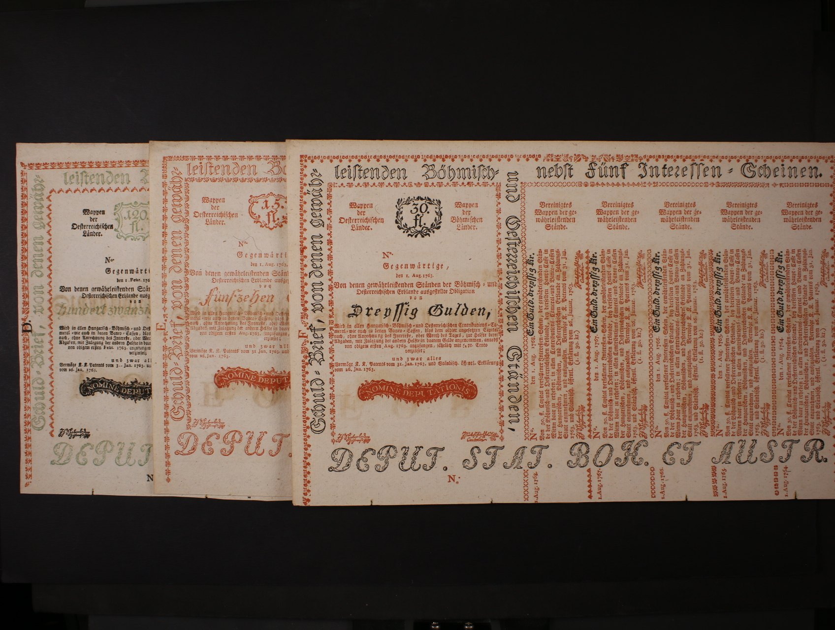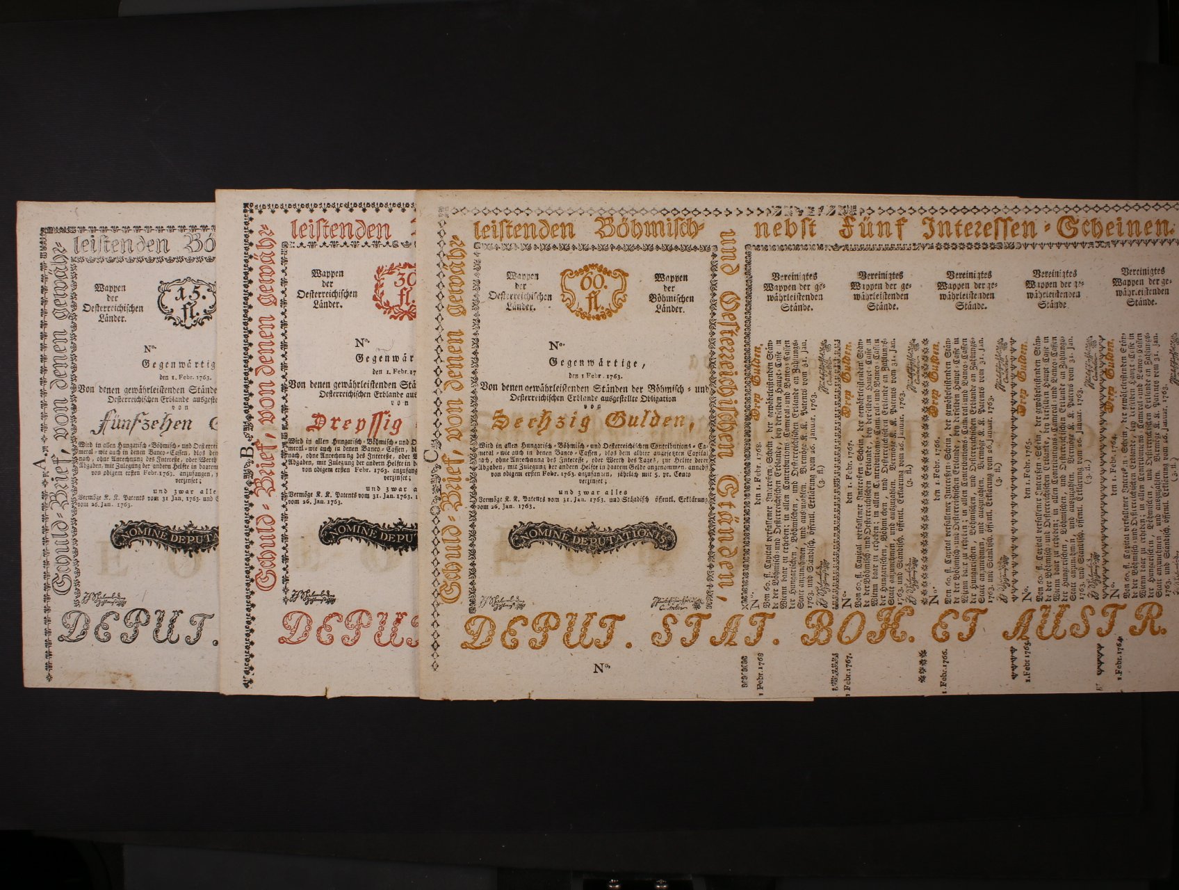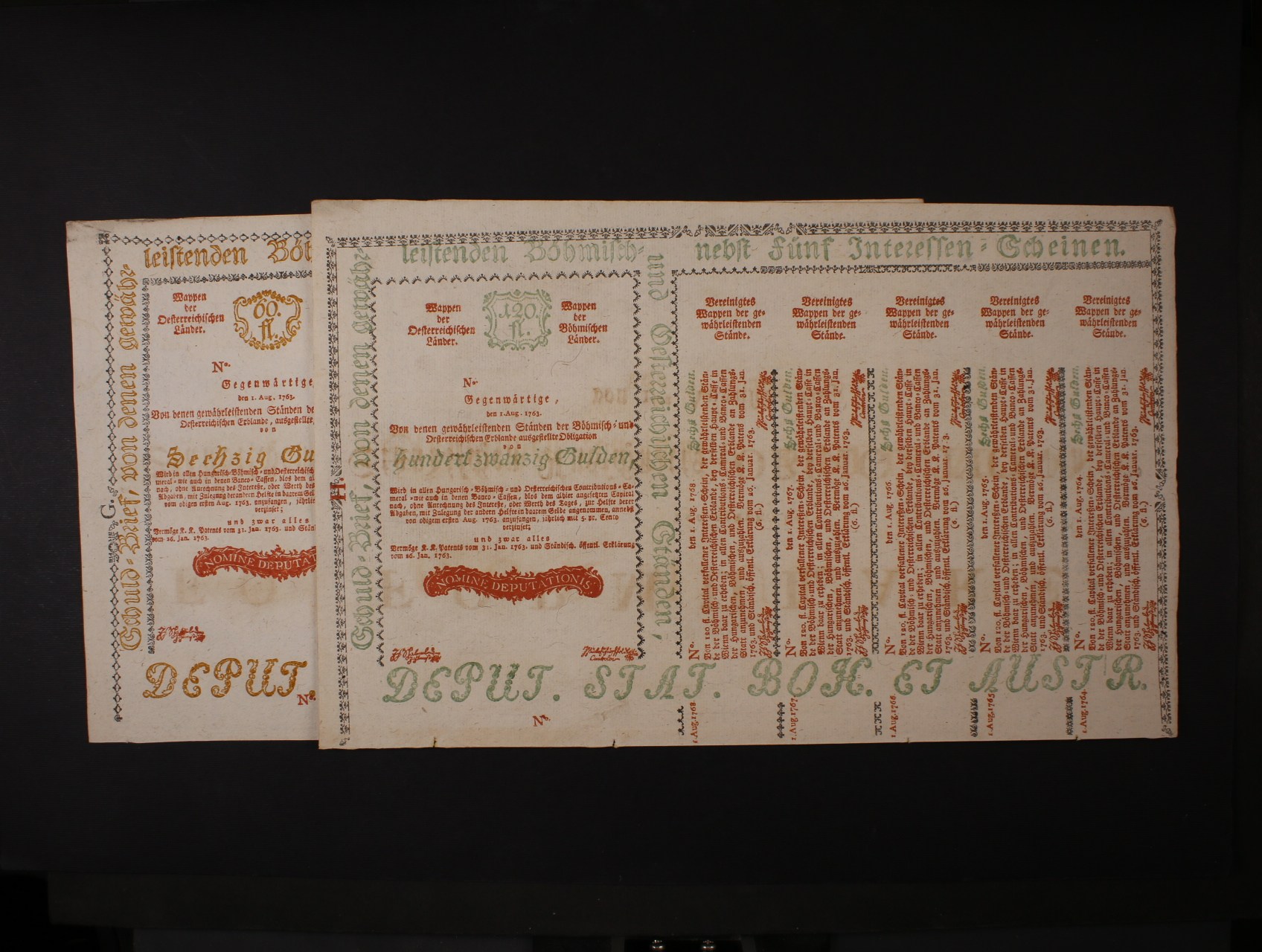 Zahlungsobligationen 1763, formuláře platebních dluhopisů s 5-ti úrokovými kupóny 15, 30, 60, 120 Gulden 1.2.1763 a 15, 30, 60, 120 Gulden 1.8.1763, Ri. W5, W6, celkem 8 kusů