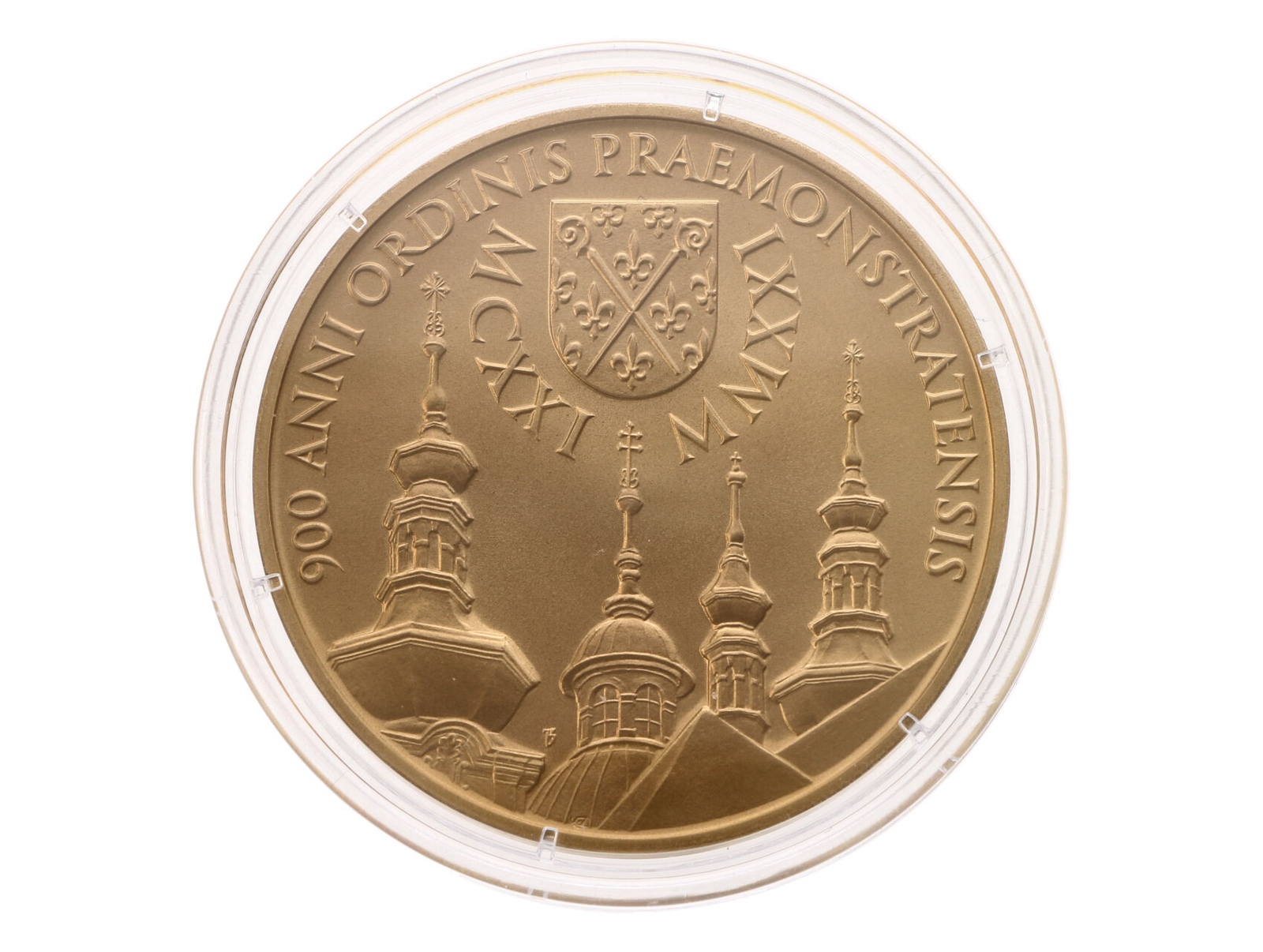 Zeman Karel 1949 - AE medaile 2020, 900. výročí premonstrátského řádu. Poprsí sv. Norberta pootočené vlevo, před tváří zářící hostie, opis / Tři věže strahovského kláštera a lucerna kaple, nahoře znak premonstrátů, opis. Mosaz 50 mm, signováno, náklad 500 ks., k tomu karta na uložení medaile, KZ302