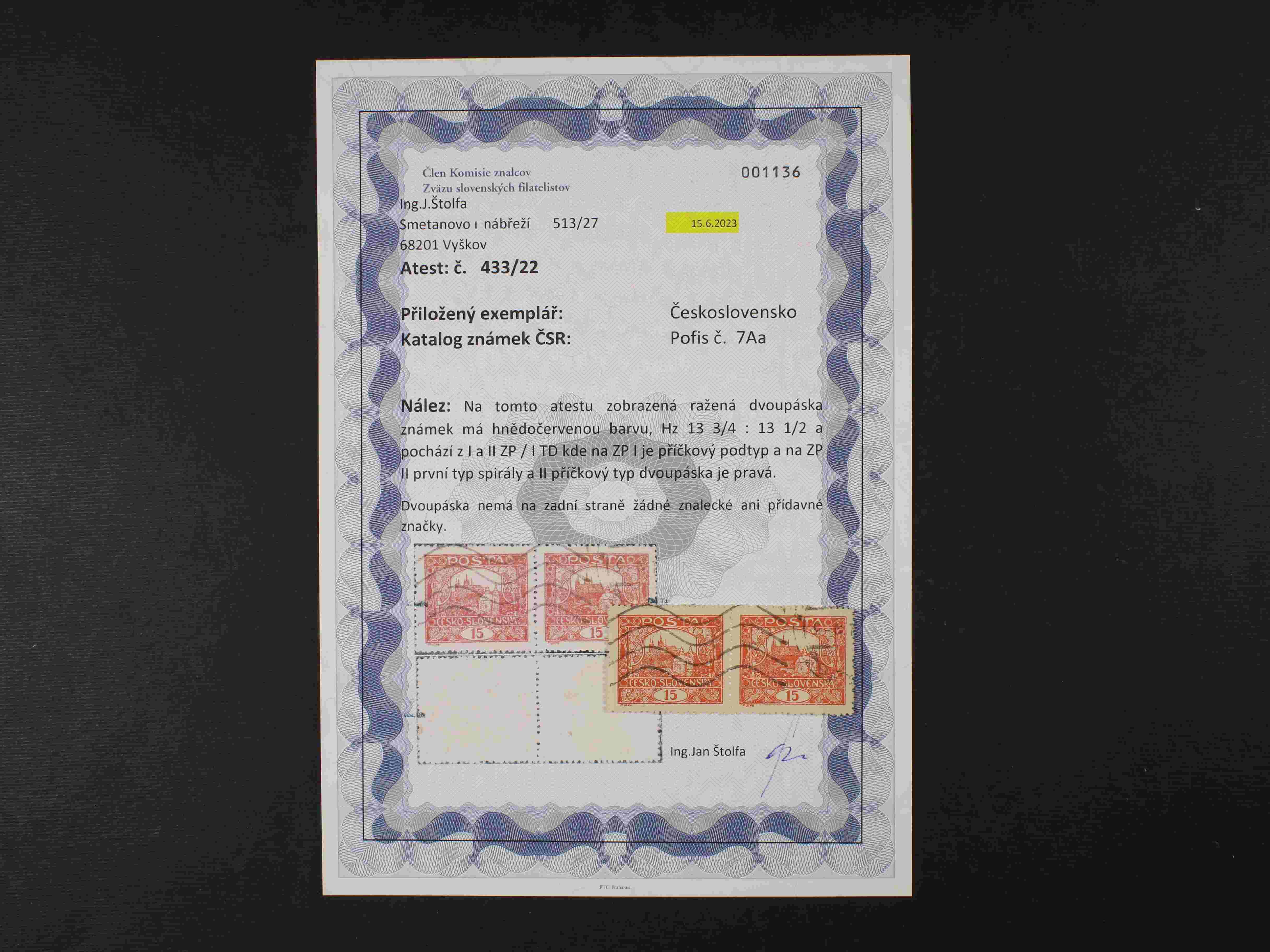 zn. č 7A a hnědočervená, ve vod. dvoupásce, kombinované ST, TD1, ZP1 příčkový podtyp, ZP2 I.typ spirály a II.typ příčky, atest Štolfa, vzácné