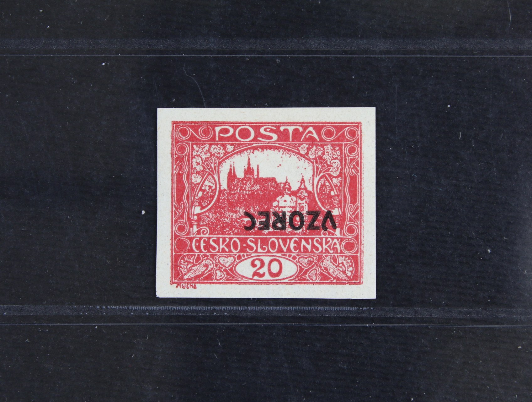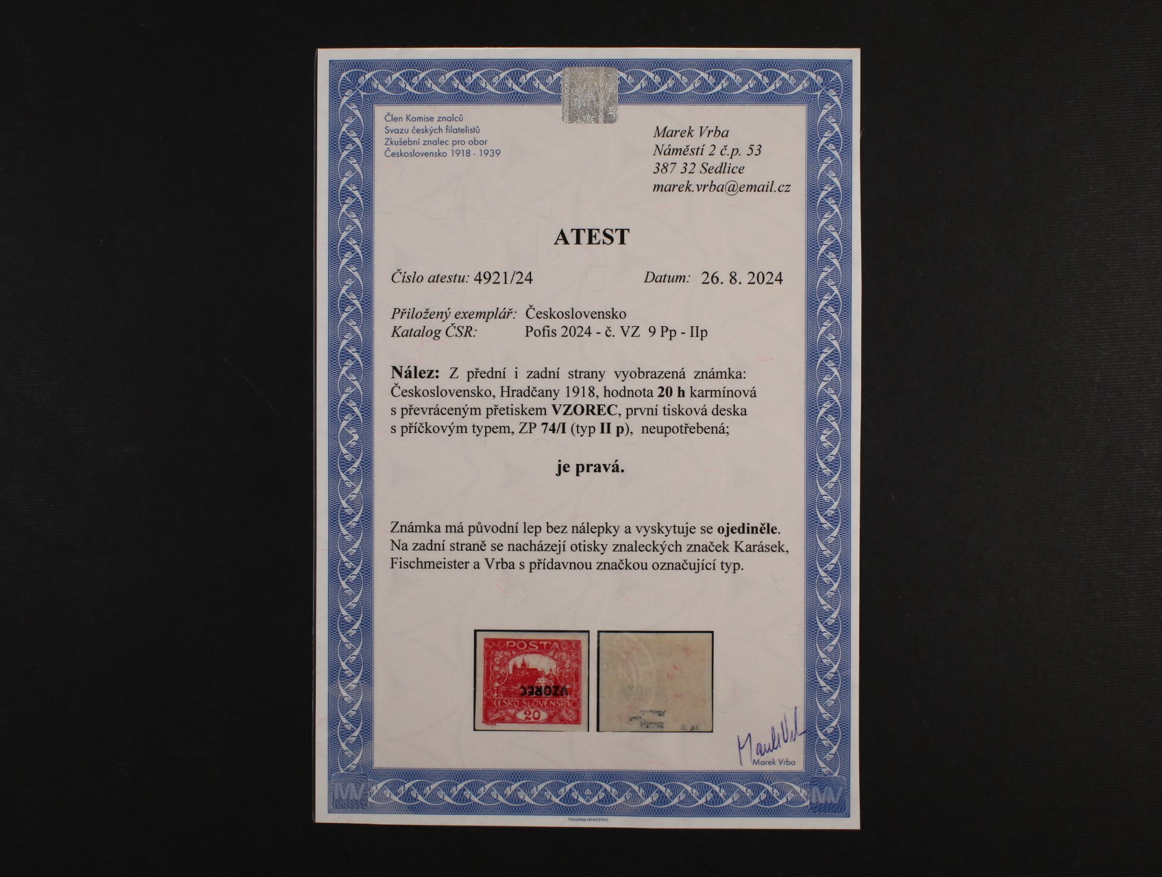 zn. č. 9 VZ, převrácený přetisk, II. typ příčky, ZP 74, TD 1, původní lep bez nálepky, zk. Karásek, Fischmeister, atest Vrba, velmi vzácné, ojedinělý výskyt