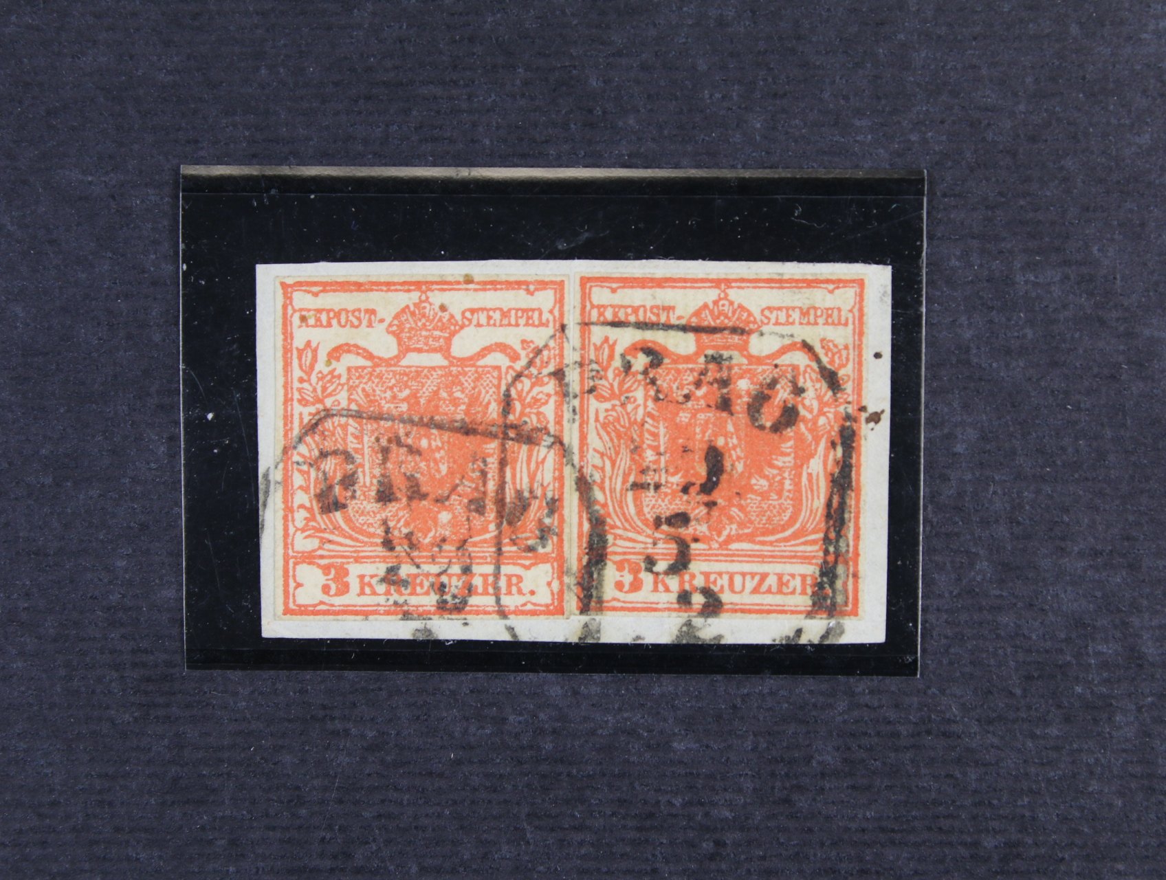 zn. Fe. č. 3 H, typ Ia 3 dunkel-zinnoberrot, gerippten papier, dvě zn. (Liliput-Schnitt) na malém výstřižku, obě s malou DV, rámeč. raz. PRAG 23.5., zk. a atest Ferchenbauer, kat. cena 400 EUR, zajímavé, vzácné