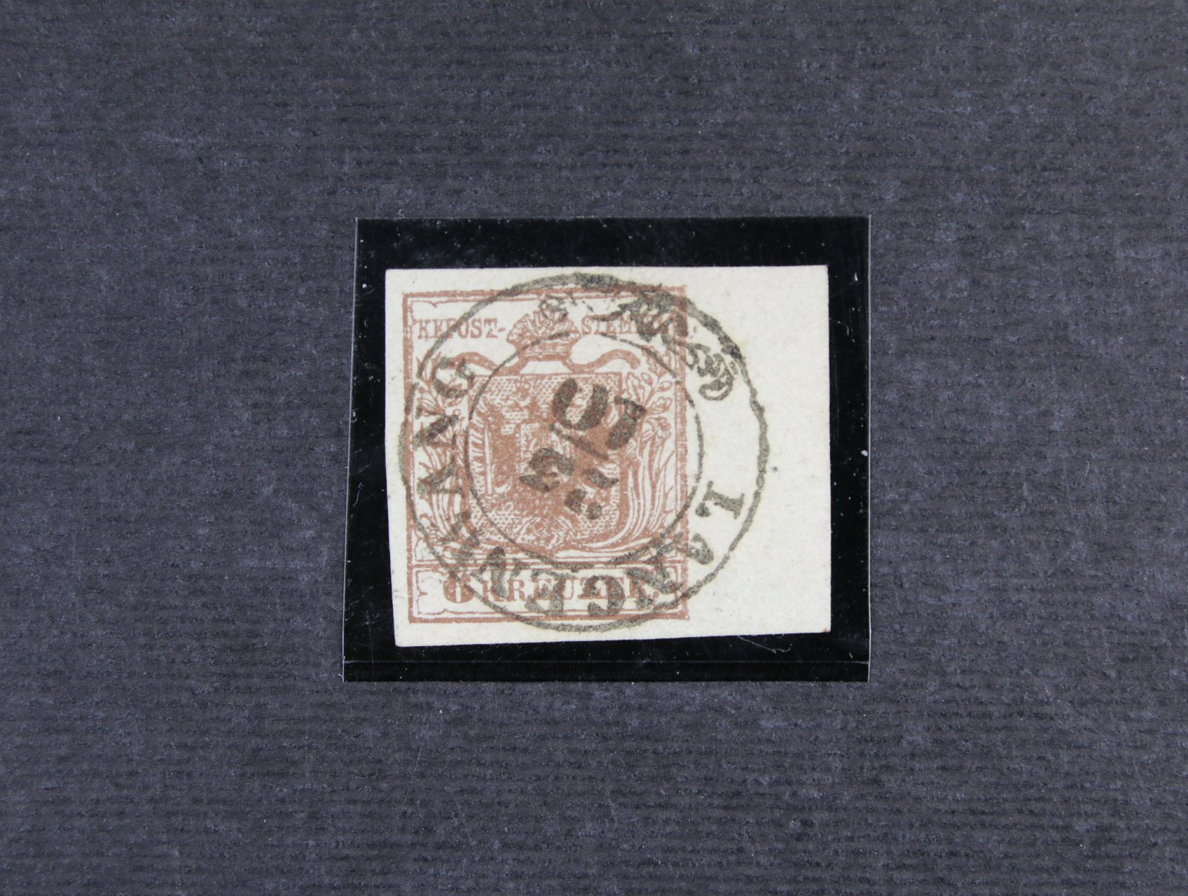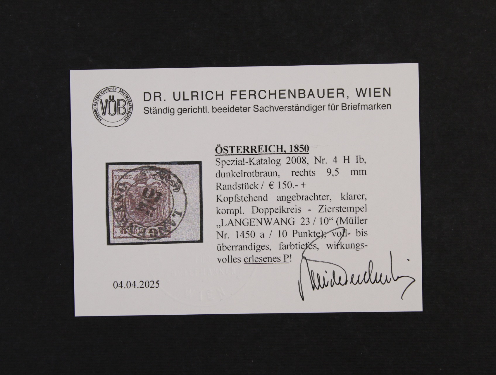 zn. Fe. č. 4 H, typ Ib tmavěčervenohnědá s pravým okrajem 9,5 mm, s kompl. dvoukruh. raz. LANGENWANG 23.10., zk. a atest Ferchenbauer, 150 EUR