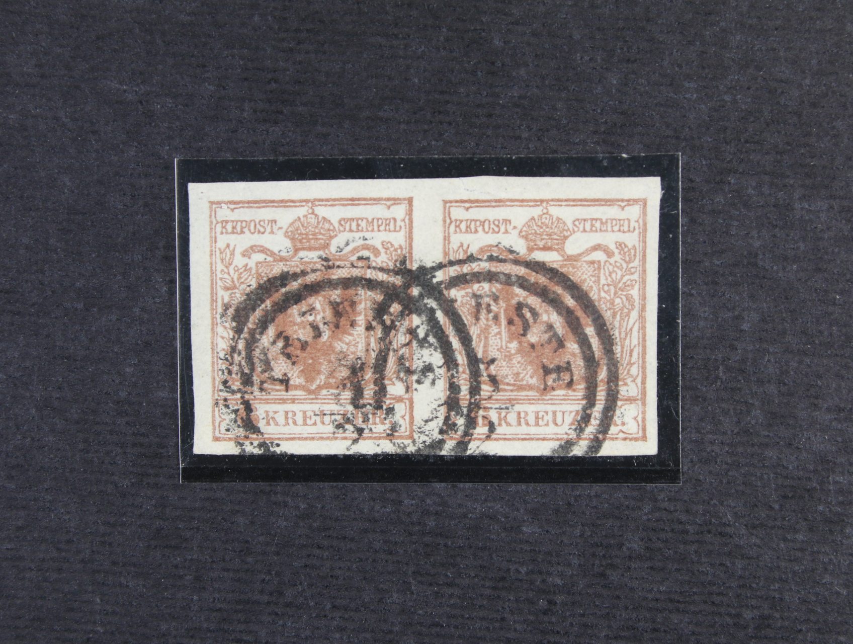 zn. Fe. č. 4 H, typ Ib tmavěhnědá ve vodorovné dvoupásce se dvěma téměř kompl. raz. TRIESTE 3.2., zk. a atest Ferchenbauer, kat. cena 150 EUR