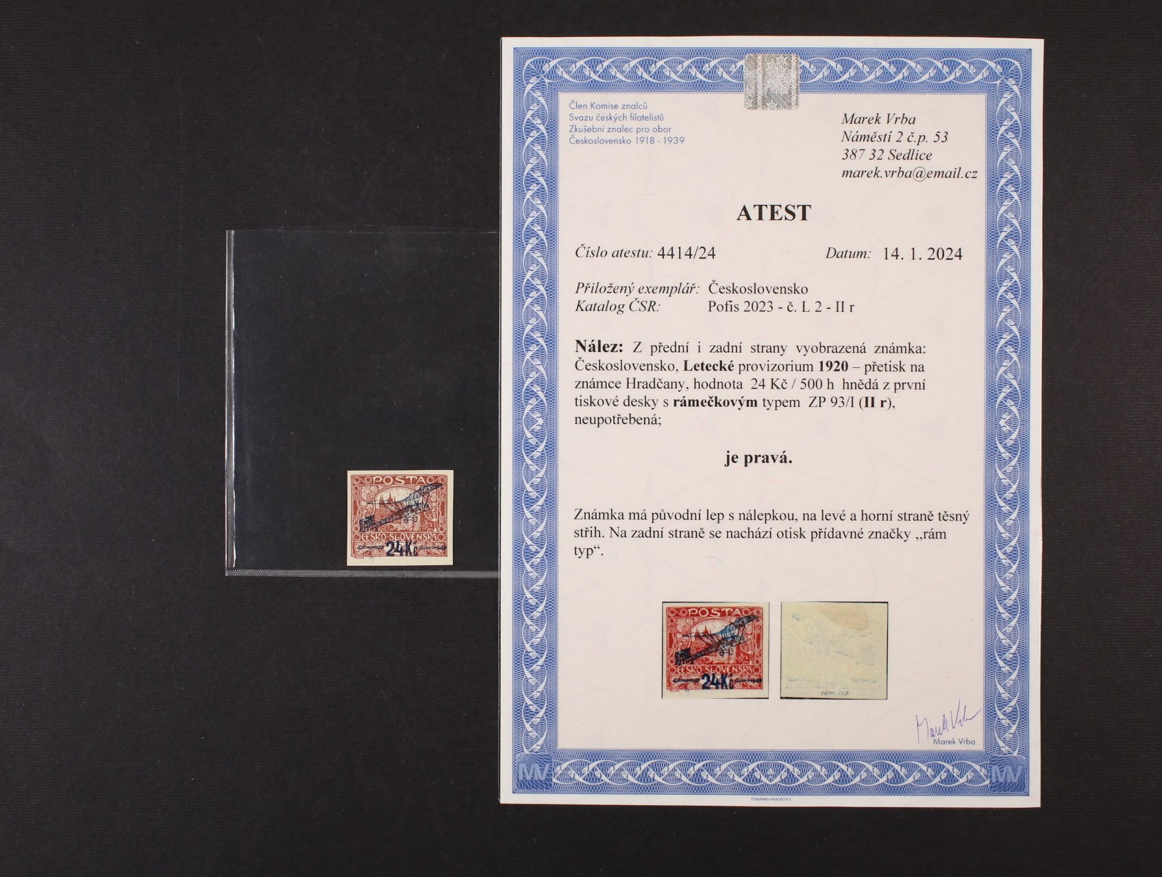 zn. L č. 2, typ II, rámečkový typ, TD 1, ZP 93, zk. a atest Vrba, na levé a horní straně těsnější střih, kat. cena 40000 Kč