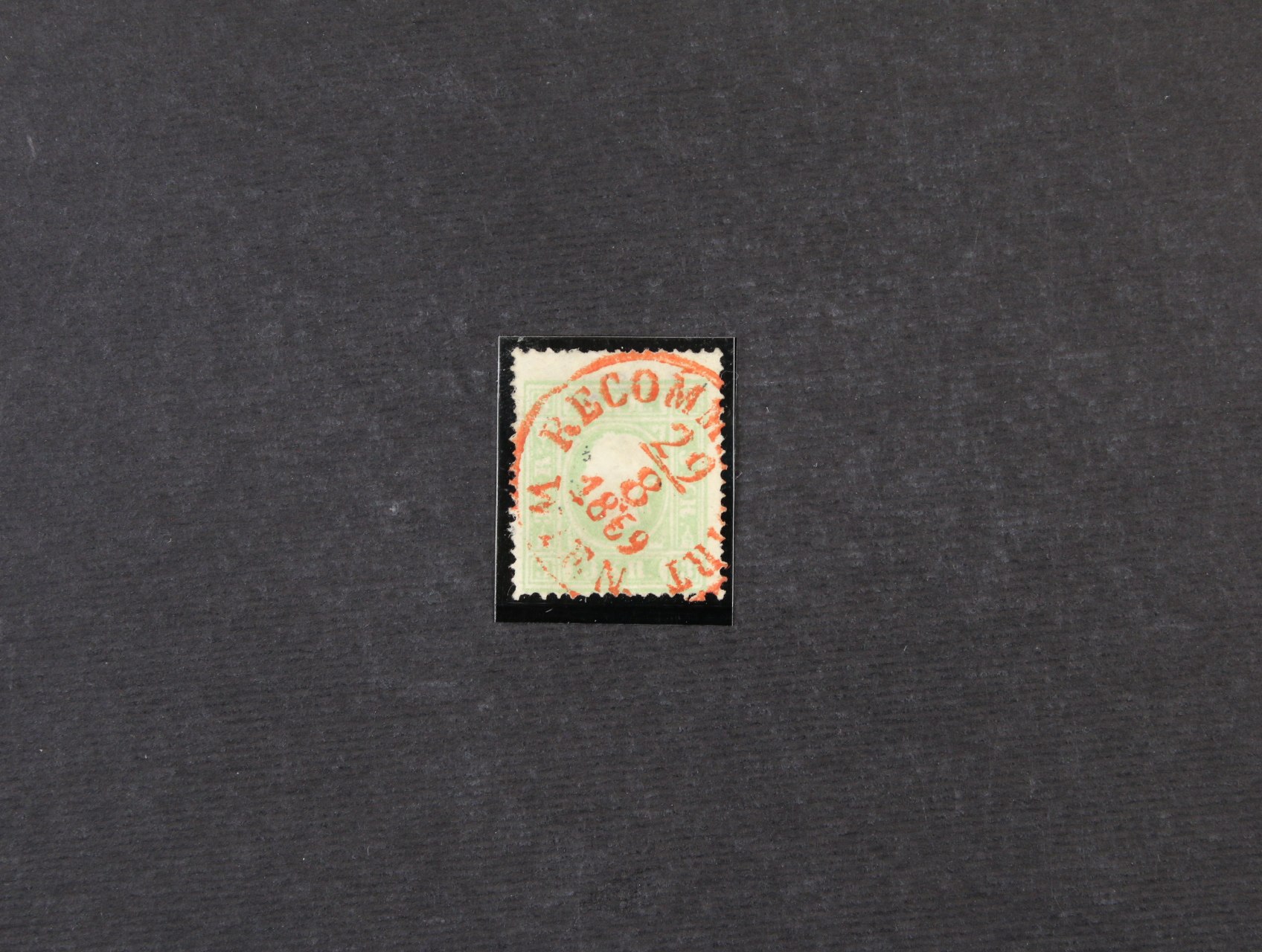 • zn. Mi. č. 12 3kr zelená s téměř kompl. červeným raz. RECOMM WIEN 29.8.1869, 300 EUR