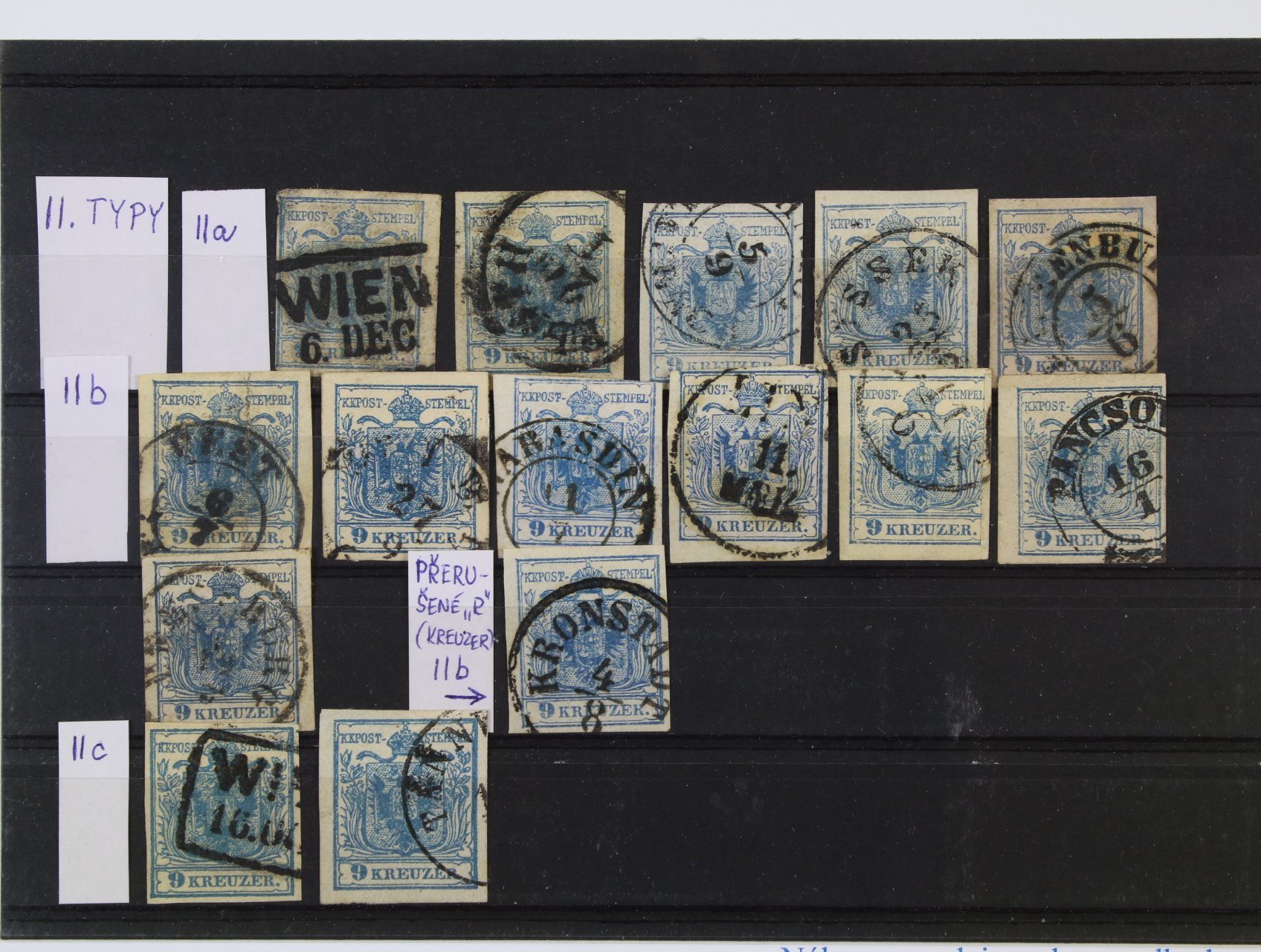 zn. Mi. č. 5 X 9kr. modrá, typ II, ruční papír - sestava 15 ks, zastoupeny typy IIa, IIb, IIc, různé odstíny barev, razítka, DV, zajímavé