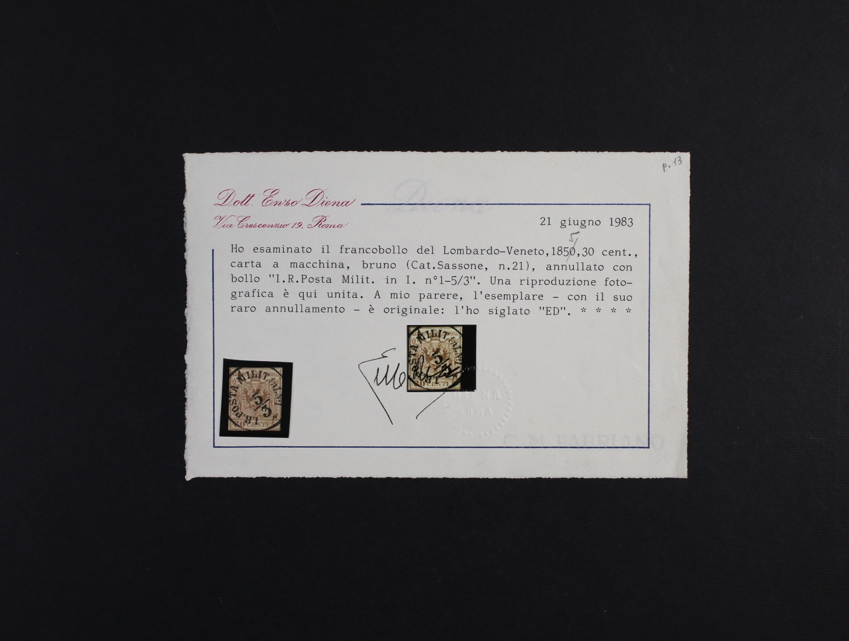 zn. Sas. č. 21 30c s téměř kompl. raz. FP I.R.POSTA MILIT. IN I. NO 1 s datací 5.3., vzácné raz. FP, atest Enzo Diena, 4500 EUR