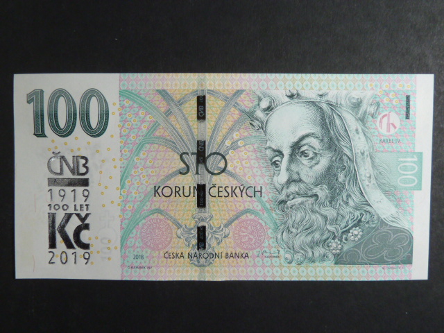 100 Kč 2019 série M 12 s přítiskem ČNB 100 LET Kč 1919 - 2019