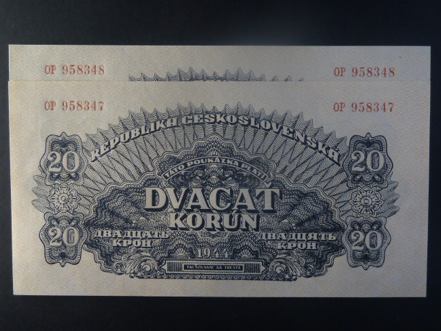 20 K 1944 série OP, číslovač 8, dva kusy s čísly po sobě