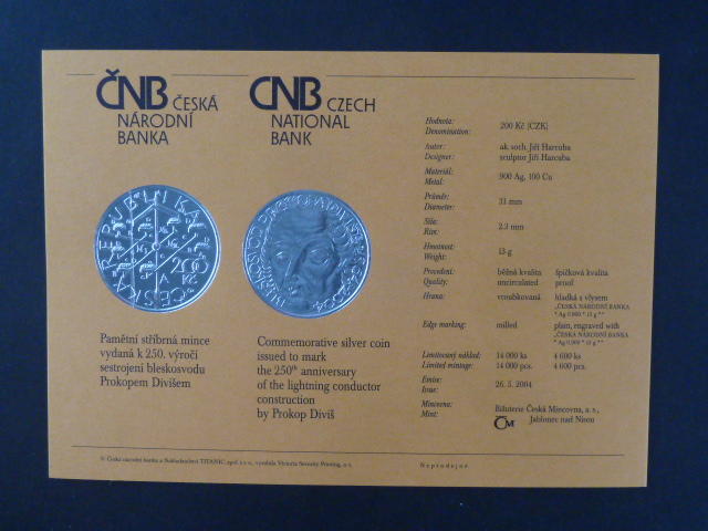 200 Kč 2004, 250. výročí sestrojení bleskosvodu Prokopem Divišem_