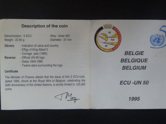 5 ECU 1995, Ag 925, 22.85 g, certifikát