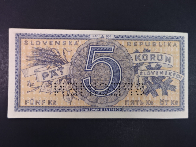 5 Ks 1945 série A 001, perf. SPECIMEN dole