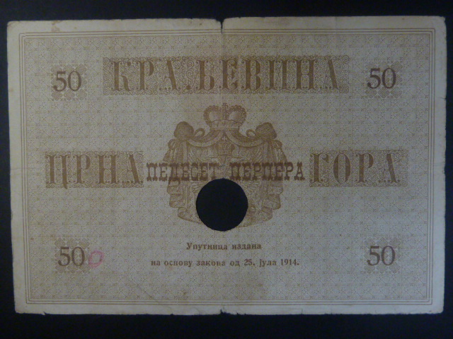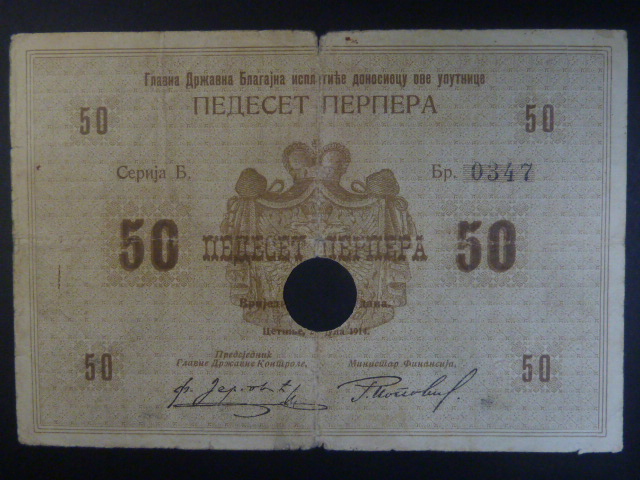 50 Perpera 1914, skartační otvor, BNB B110a, Pi. 12