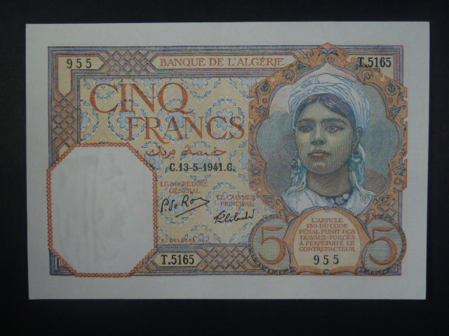 ALŽÍR, 5 Francs 1941, BNB. B123d, Pi. 77b