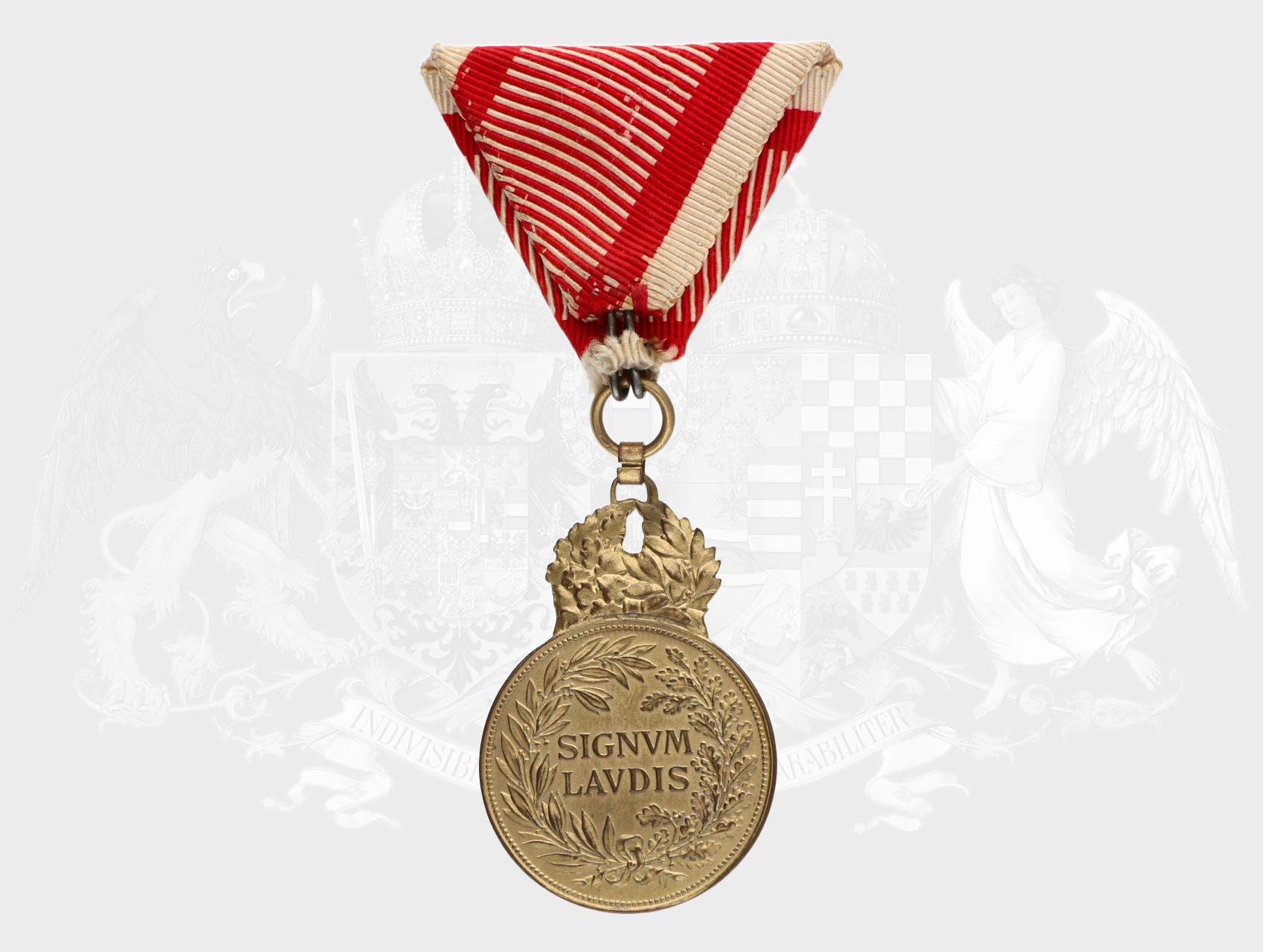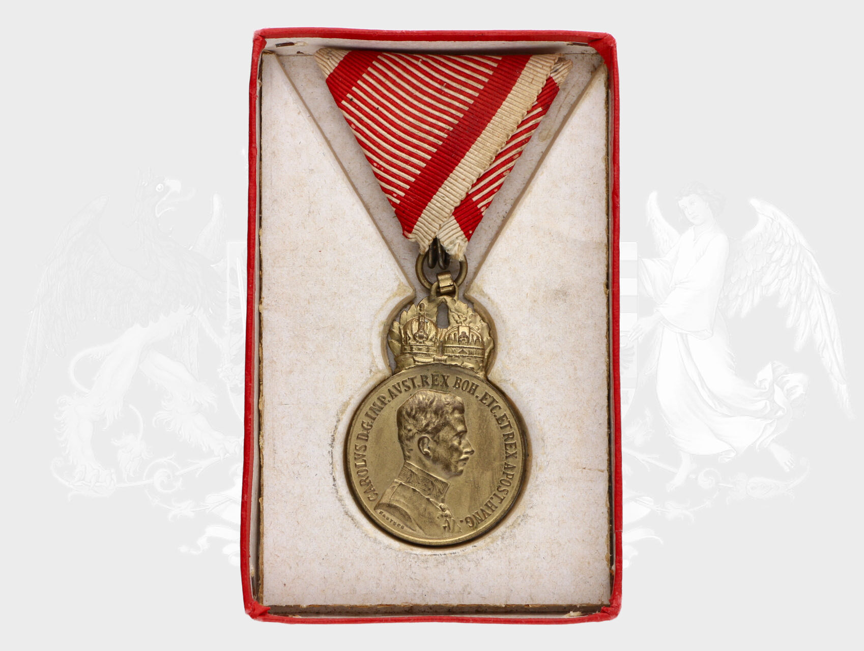 Bronzová vojenská záslužná medaile - SIGNUM LAUDIS Karel I., původní vojenská stuha, na hraně značka BRONZE, originální etue