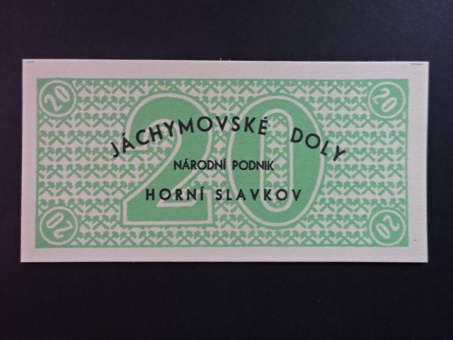 Jáchymovské doly n.p. Horní Slavkov, poukázka 20 K b.d. v zelené barvě