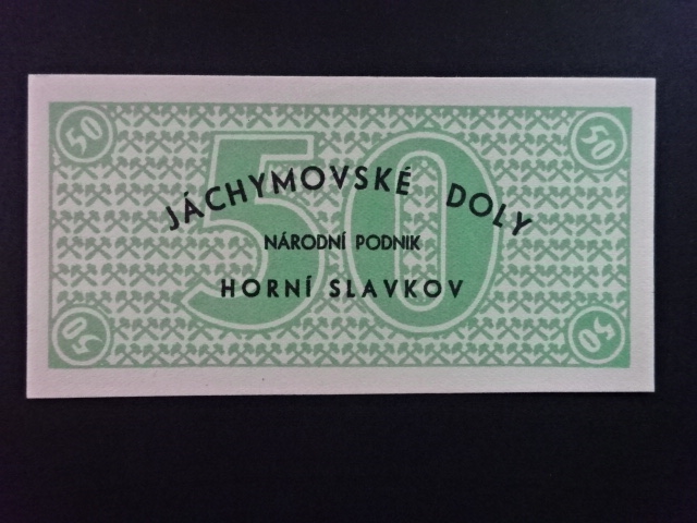 Jáchymovské doly n.p. Horní Slavkov, poukázka 50 K b.d. v zelené barvě