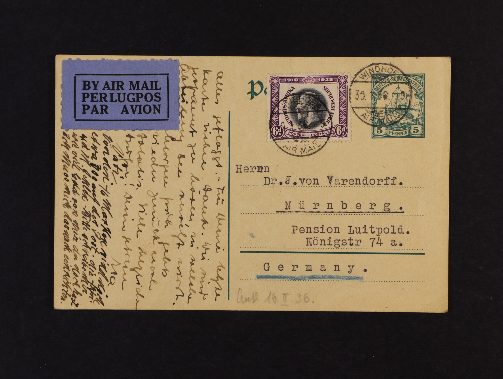 KL DEUTSCH - SÜDWESTAFRIKA 5pf dofrank. zn. Jižní Afriky 6d, zaslaná letecky do Německa s pod. raz. WINDHOEK 30.1.36, zajímavé