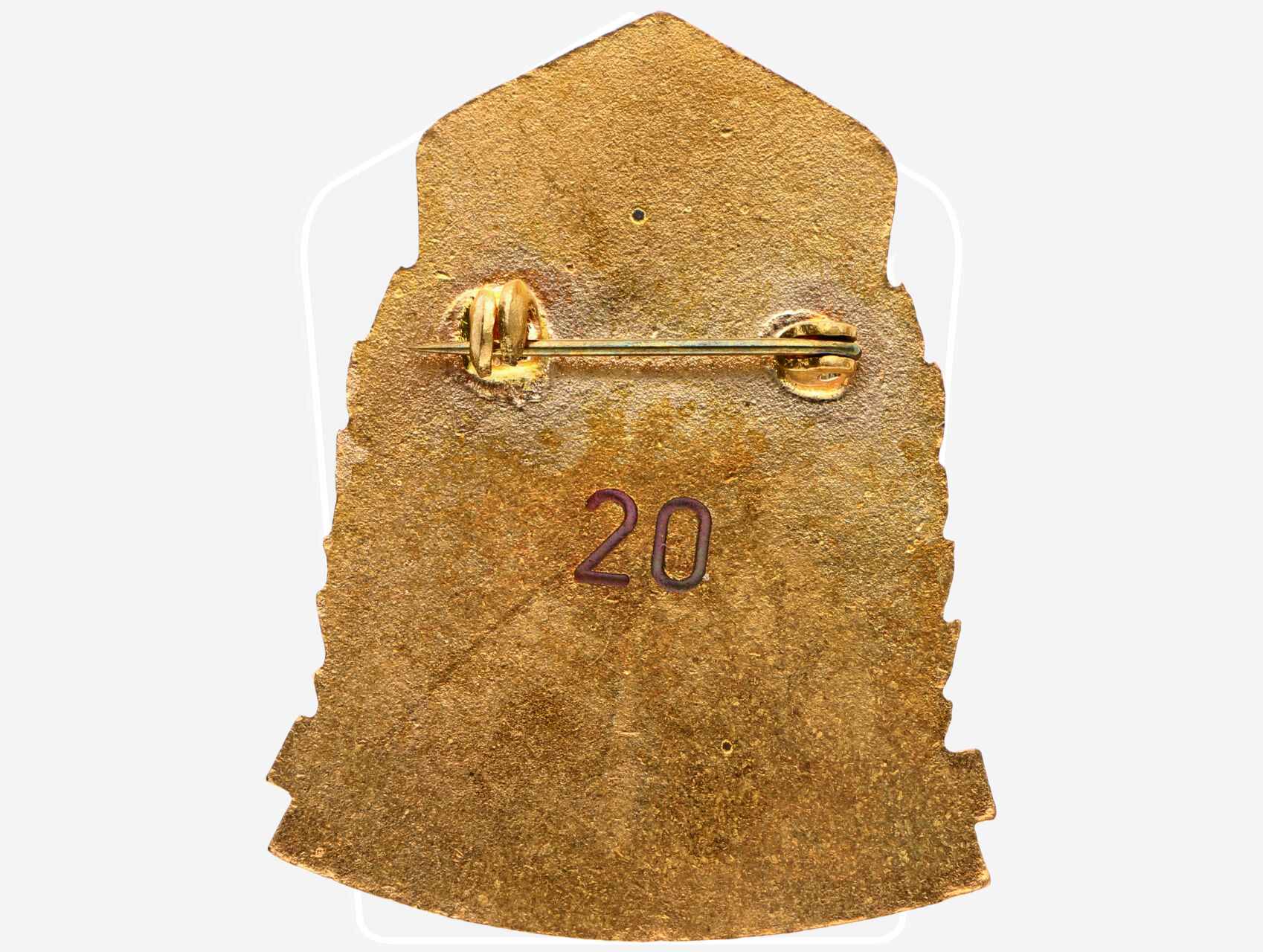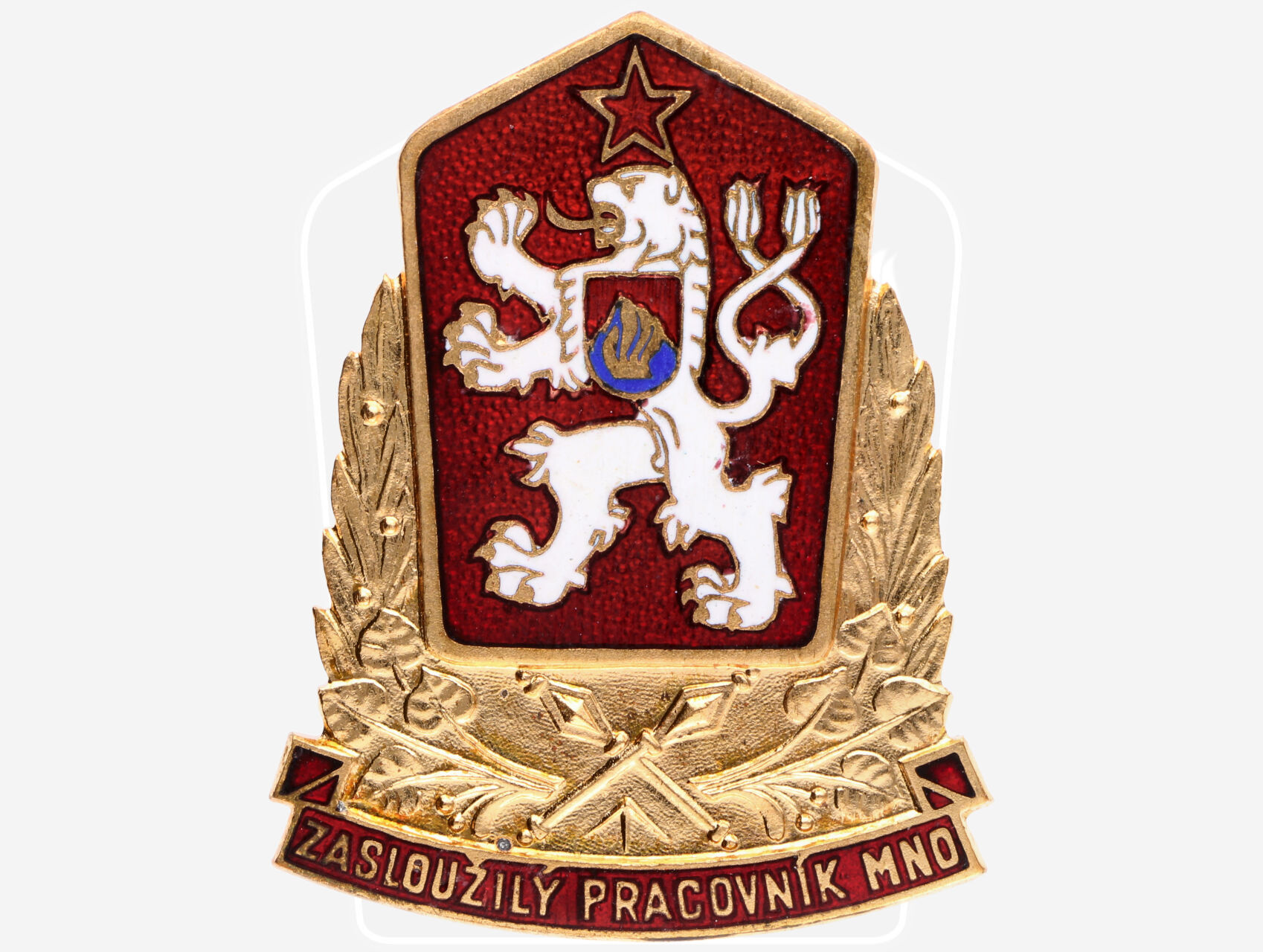 Odznak Zasloužilý pracovník MNO č.20, pozlacený bronz, smalty, 47x36 mm, upínání na vodorovnou jehlu