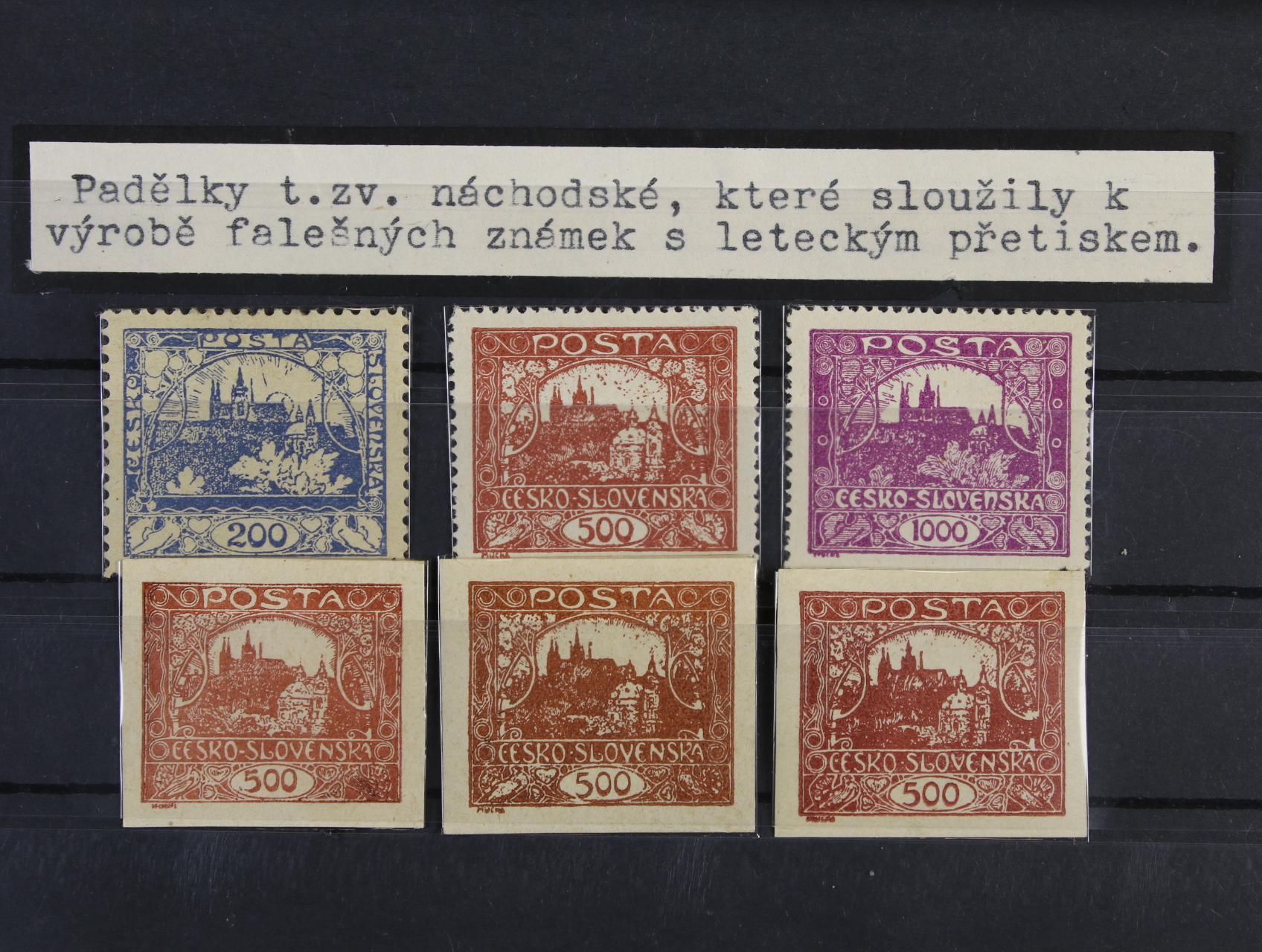 sestava 6 ks náchodských padělků, které byly používány k výrobě falešných zn. s leteckým přetiskem, zajímavé pro studijní účely